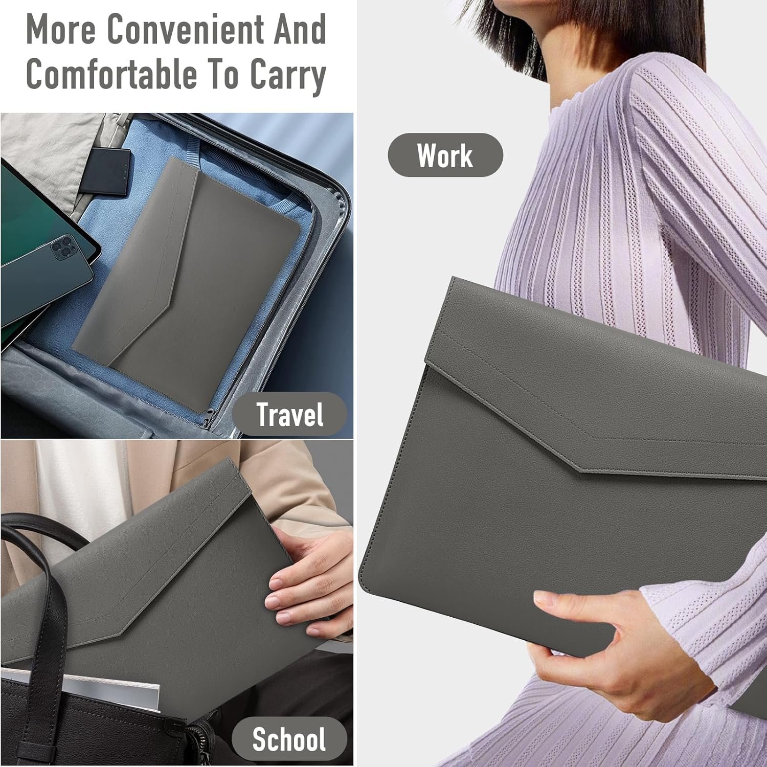 3.【Premium Material】This laptop bag combines: 1. Premium PU leather exterior: Waterproof, stain-resistant and scratch-resistant. 2. Thick and soft plush inner lining: absorbs impacts and prevents chafing. 3. DUAL MAGNETIC CLOSURE – Two magnets make it easy to open/close with one hand.