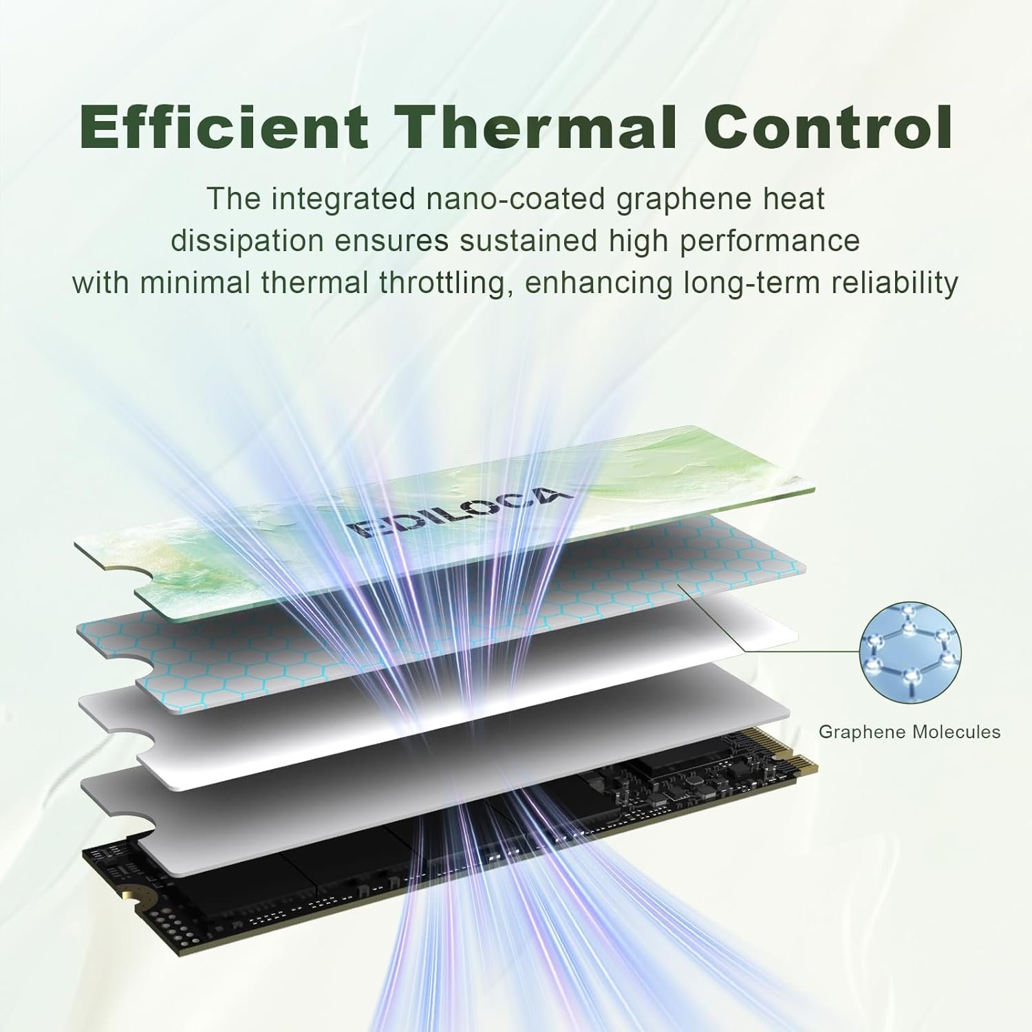 【Excellent Performance】 EDILOCA EN680E NVMe 1TB SSD leverages NVMe 1.4 technology and dynamic SLC caching to deliver accelerated boot times and rapid data transfers. The integrated nano-coated graphene heat dissipation ensures sustained high performance with minimal thermal throttling, enhancing long-term reliability.