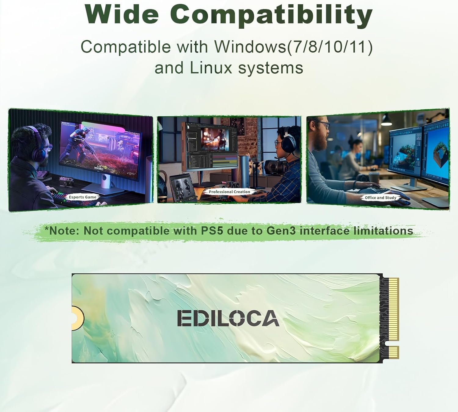 【Wide Compatibility】Featuring a M.2 2280 (PCIe Gen3x4) form factor, this m.2 ssd 1TB is compatible with Windows(7/8/10/11)/Linux systems and most laptops/desktops with NVMe slots. *Note: Not compatible with PS5 due to Gen3 interface limitations.