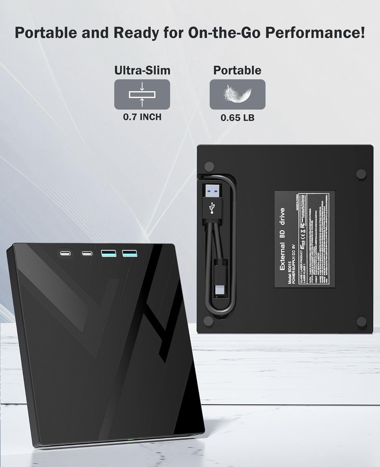 COMPACT & PORTABLE DESIGN – With its lightweight and slim design, this external Blu-Ray drive is perfect for on-the-go use. It slips easily into your purse or backpack, making it the ideal companion for business trips, travel, or work from home.