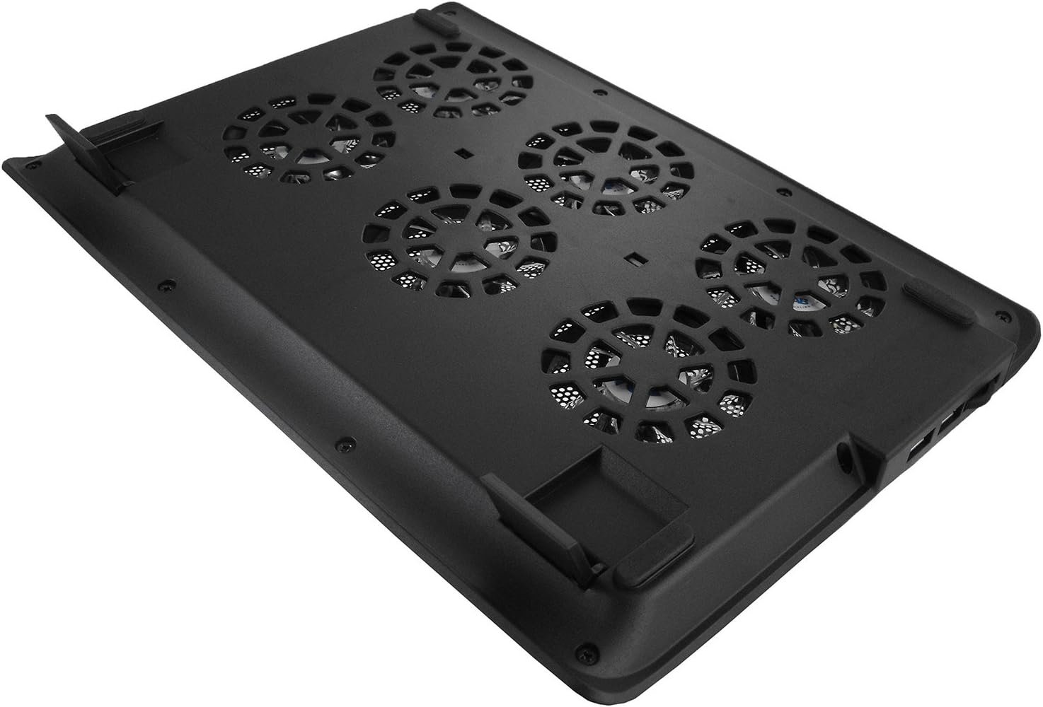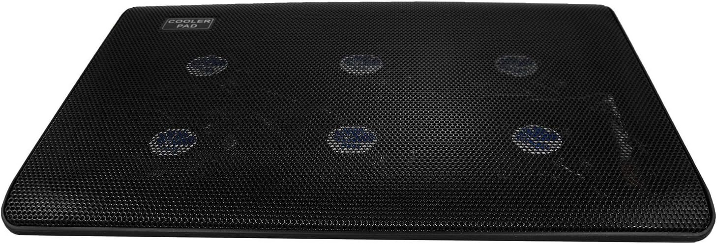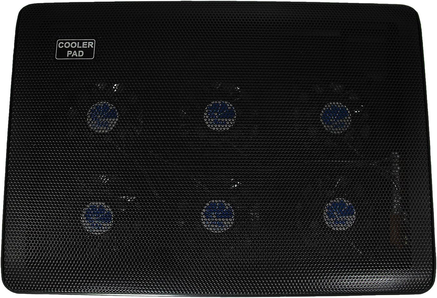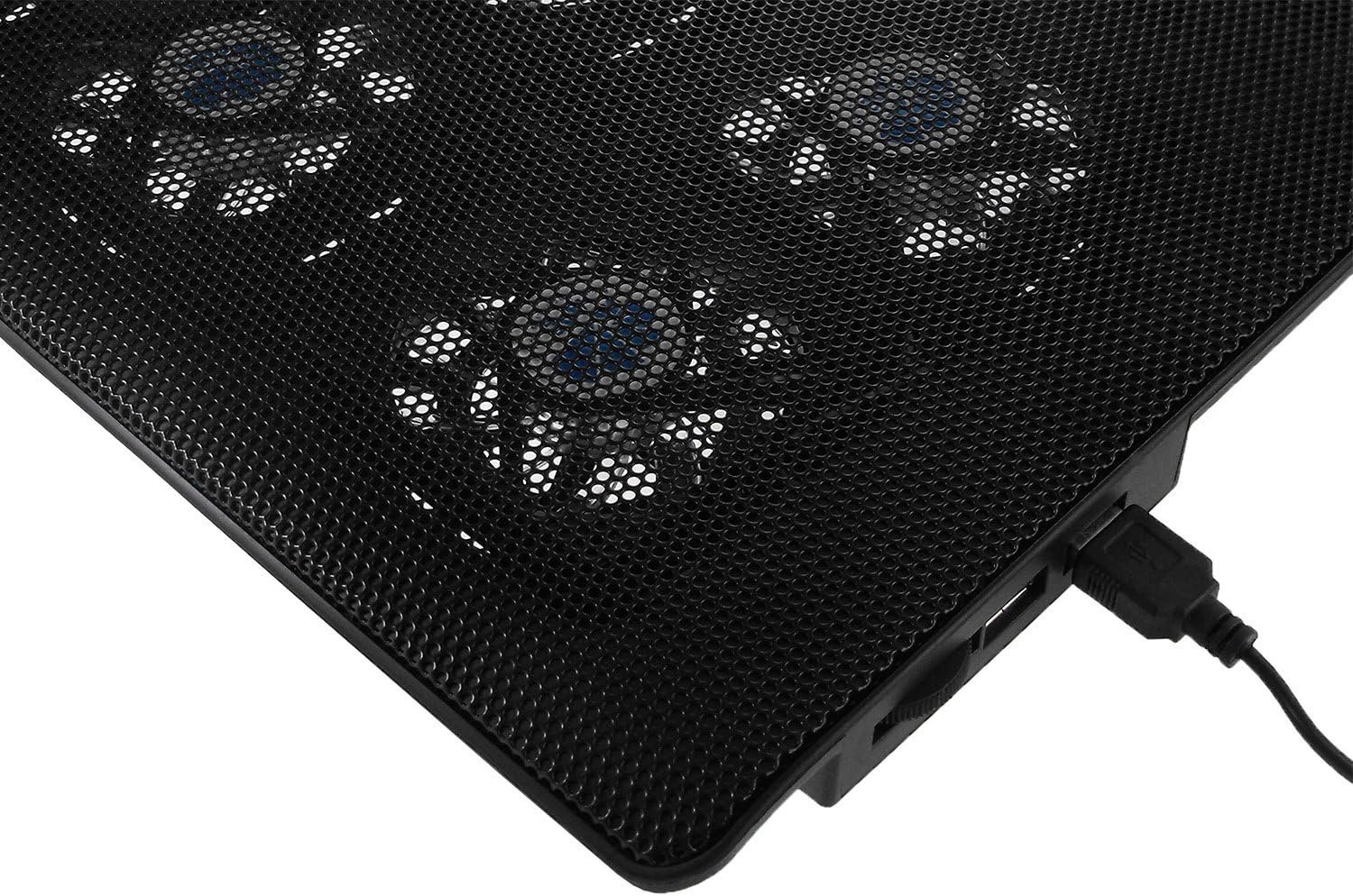 Ventiladores de 70 mm con LED azul muy eficientes 2 x USB 2.0 Patas adicionales para aumentar el ángulo de inclinación Rejilla de aluminio perforado Almohadillas antivibración debajo Interruptor de encendido/apagado, regulador de velocidad del ventilador