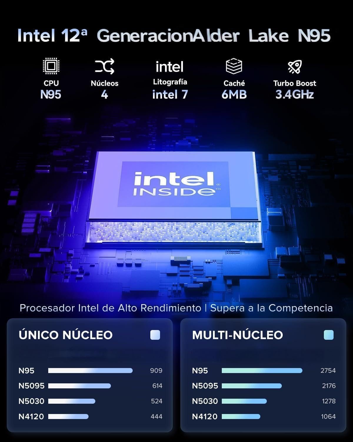 【In-el N95 Processor】: 6MB cache, up to 3.4GHz. Lithograph: In-el N95. AOC notebooks use a 7nm process, which improves system fluidity and performance, with an overall 70% increase compared to the previous generation. Exceeds Celeron models N4000/N5095/N4020/N100.
