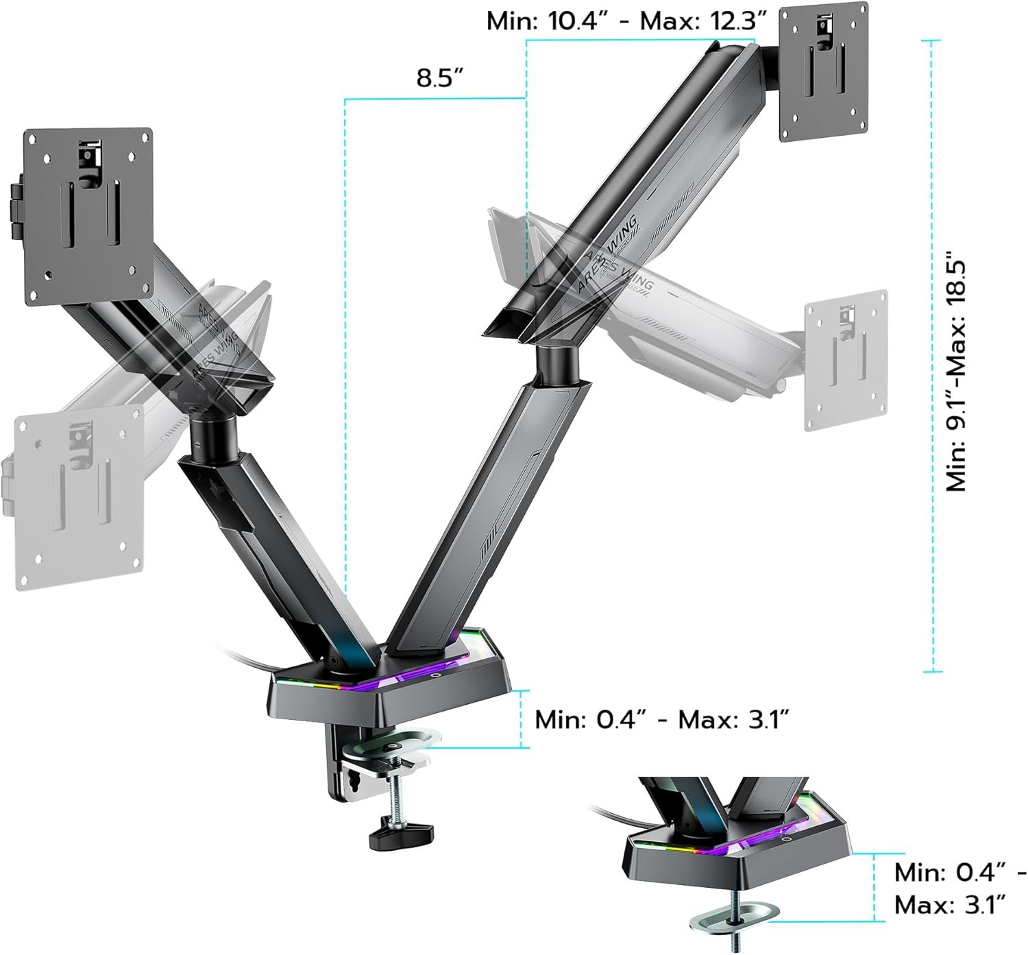 FLEXIBLE ADJUSTMENT & IDEAL FOR MULTIPLE TASKS – ARES WING dual arm monitor stand offers 18.5″ of height adjustment, allowing -60° to +60° tilt, ±90° rotation, and 360° swivel. This design helps relieve the strain of slouching, allowing you to comfortably participate in exciting esports competitions. With the ability to position two monitors at optimal heights and angles, you can easily switch between tasks, access multiple apps, and collaborate effectively.