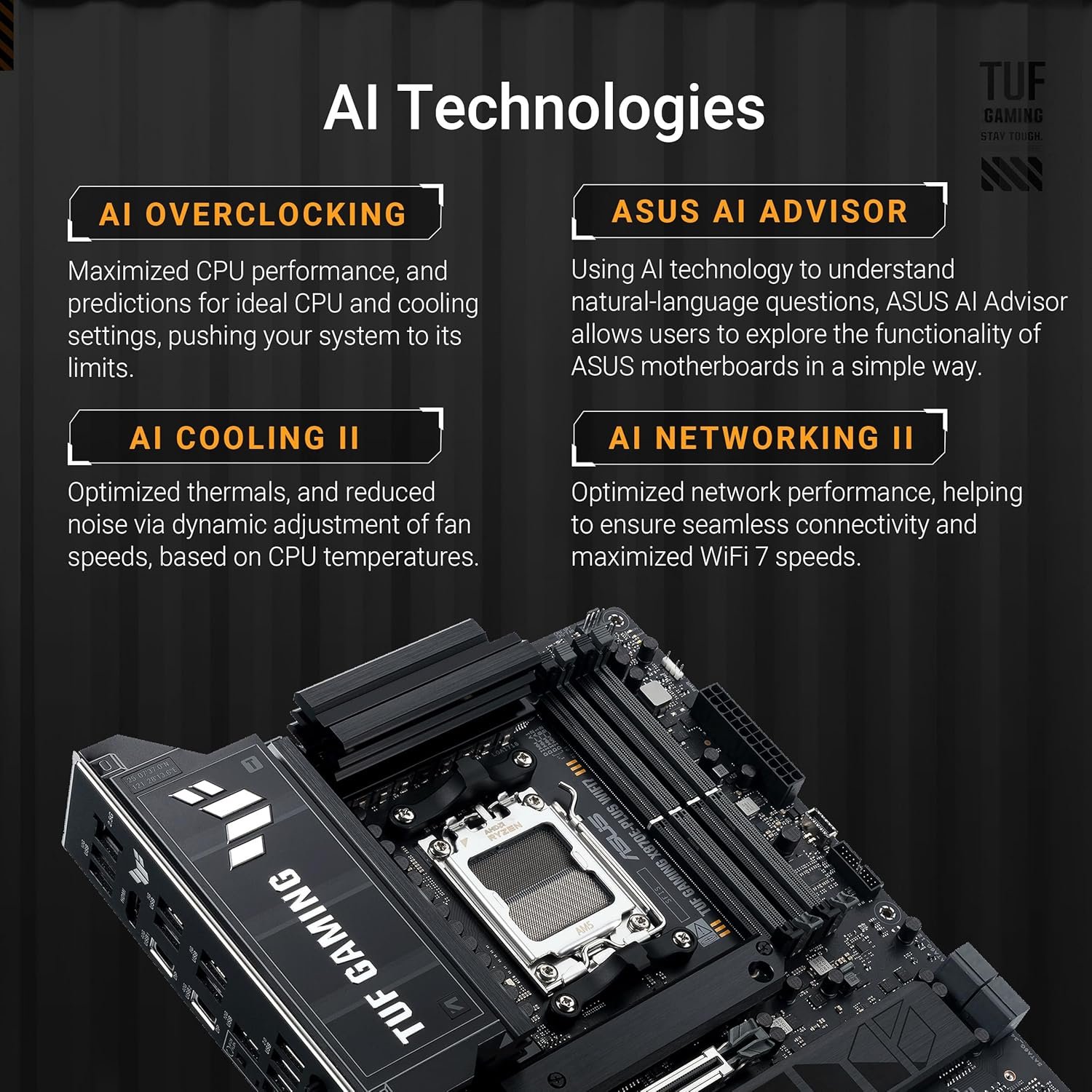 Intelligent control: ASUS exclusive AI Overclocking, AI Cooling II, AI Networking II, and AEMP to simplify setup and improve performance