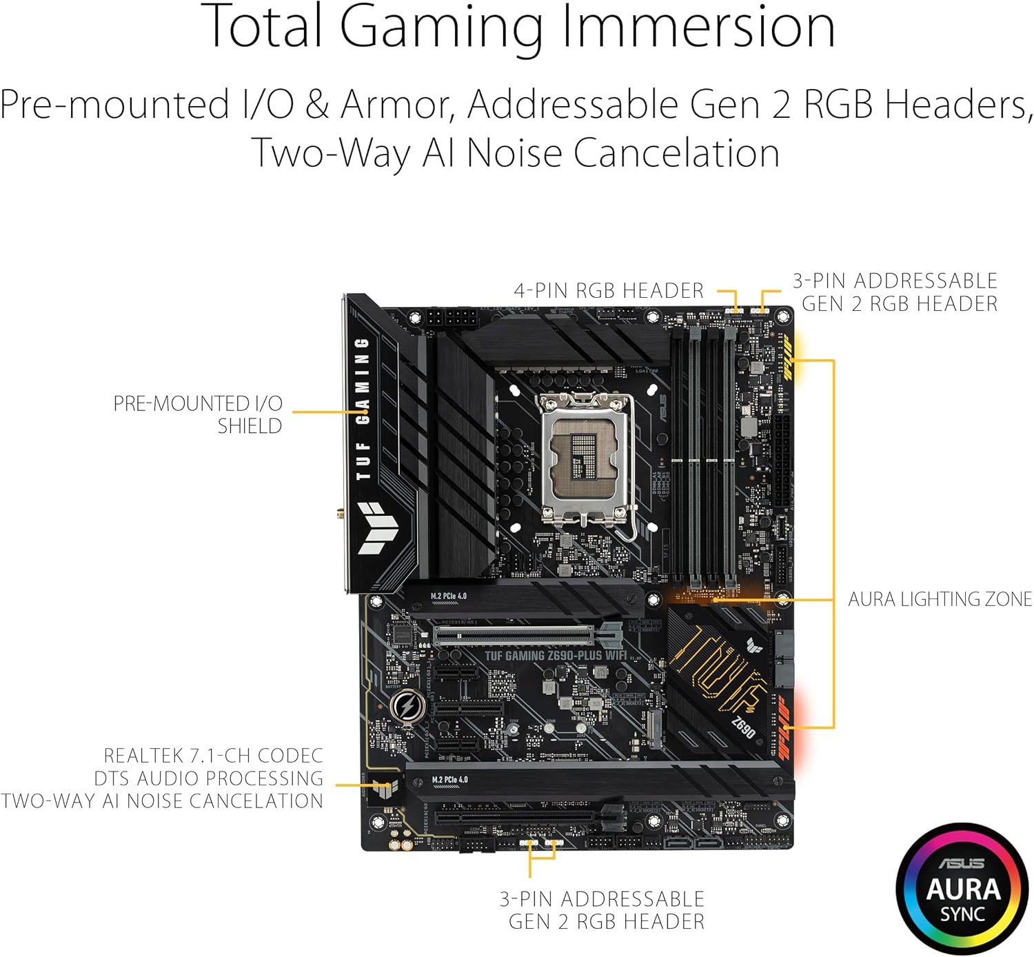 NEW TUF GAMING AESTHETIC – New ID design, synchronizable LED effects across a broad portfolio of compatible PC equipment, including addressable RGB strips with Aura Sync