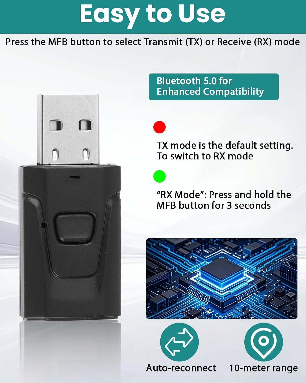 EASY TO USE & SIMPLE SETUP: Setting up the Bluetooth car adapter is a breeze. Just press the multi-function button for 3 seconds to switch between TX and RX modes. Once paired with your devices, it automatically connects the next time you use it. The Bluetooth USB adapter is small and easy to carry, perfect to carry everywhere and enjoy music and calls anytime.