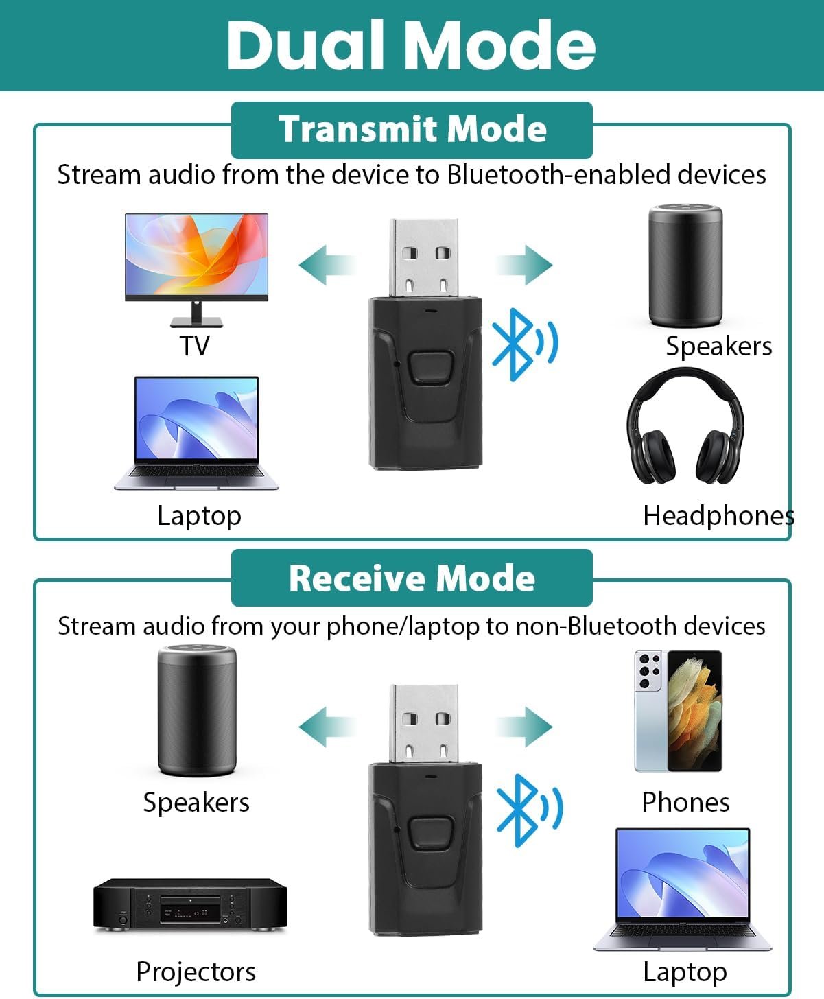 2-in-1 Receiver & Transmitter: This Bluetooth USB adapter is versatile and works as both a transmitter and receiver. In TX mode, you can stream audio from non-Bluetooth devices, such as your TV or PC, to your Bluetooth headphones, speakers, or even devices like airplane entertainment. In RX mode, you can connect your non-Bluetooth speakers to the adapter and enjoy wireless music, ideal for cars, Hi-Fi systems and other non-Bluetooth devices.