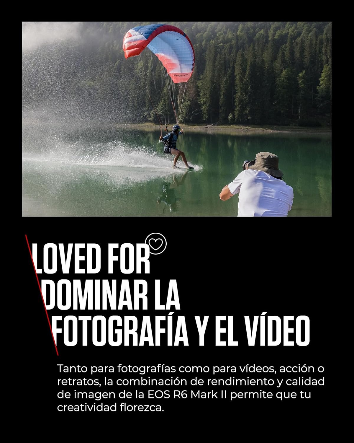 Master your photography and shooting with the EOS R6 Mark II, an innovative hybrid camera that delivers uncompromising quality in any situation thanks to its 24.2 megapixel full-frame CMOS sensor and DIGIC X processor. Tell stories in low light with ISO reaching up to 102,400 (ext. to 204,800) and the ability to focus in as low light as -6.5EV. With up to 40 fps1 continuous shooting and 0.5 seconds of pre-shot, capture microscopic moments. Focus and track subjects with greater speed and precision with deep learning AI and Dual Pixel CMOS AF II2 technology. Get smooth images with the 5-axis body integrated IS that, when combined with optical IS, reduces camera shake by up to 8 steps3. Get cinematic results with 4K 60p, 6K RAW4, and Full HD 180fps oversampled slow motion video and get creative control with exposure modes, aspect markers, and up to 6 hour recording5. With the 3.69 million point EVF being upgraded to 120 fps and conveniently located AF multicontroller, there’s no need to take your eyes off the sharp view. Create content your way with two card slots, 3.5mm microphone and headphone inputs and a micro-HDMI for external recording. Easily connect to a smart device to share files and remote control the camera with always-on Wi-Fi and Bluetooth 5.0, shortening your workflow. What’s in the EOS R6 Mark II Case Body; R-F-5 Camera Cover; EOS R6 MARK II Strap; ER-SC2 Shoe Cover; LC-E6E Battery Charger; LP-E6NH Battery; Battery Cover; AC Cable; User Manual Kit 1. Continuous shooting speed may vary. 2. Apl. when the subject frame is displayed during tracking and the compatible lens connected. Ref. to «cam.start.canon» for details. 3. Yaw/pitch direction, based on CIPA standard. 4. Externally via HDMI output 5. If the internal temperature of the camera becomes too high, the maximum recording time will be reduced.
