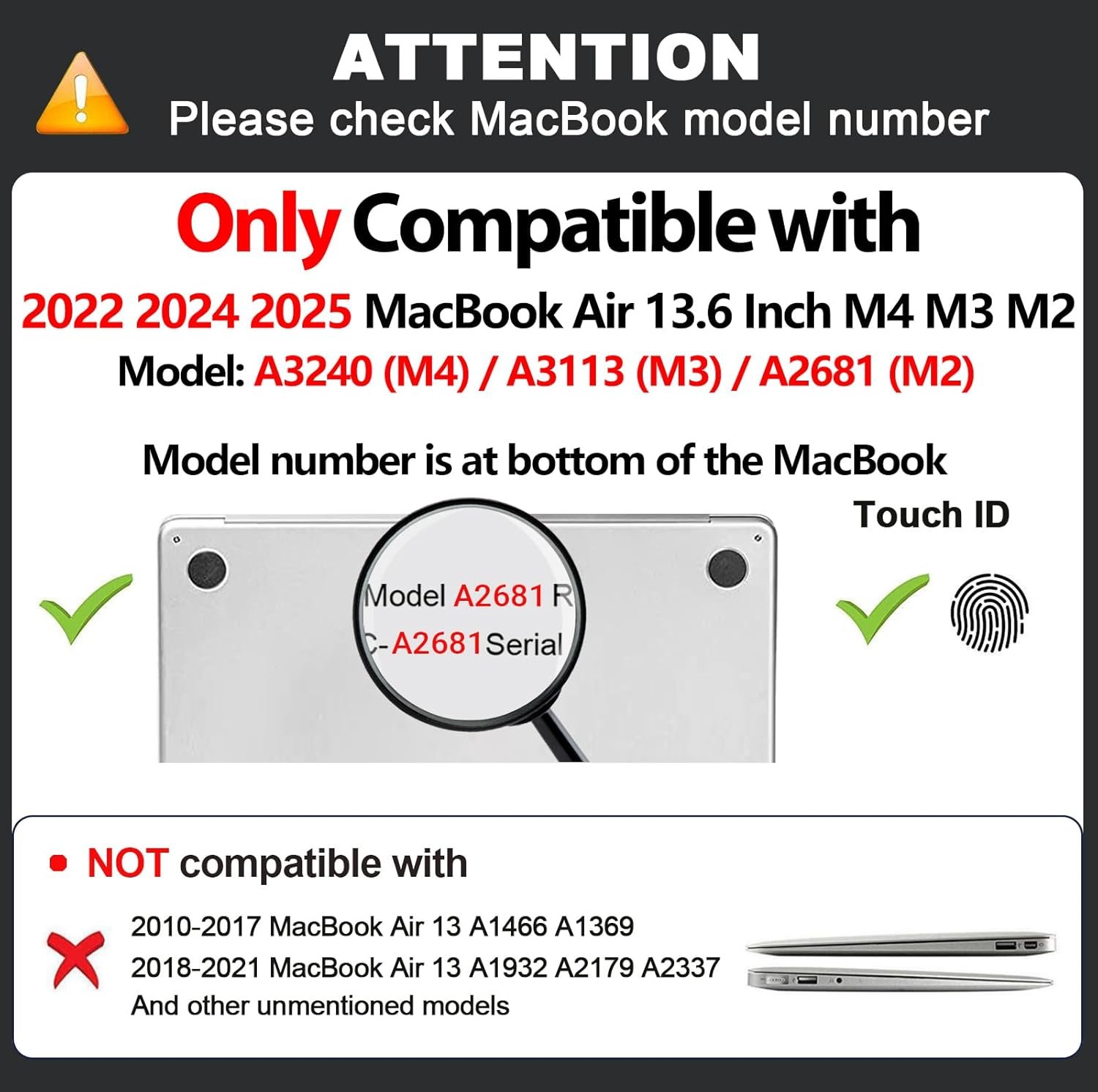 Please carefully check the model number of your laptop before protective case for MacBook Air 13.6 inch M4 M3 M2 (2025 2024 2022 release). The model number (A3240 A3113 A2681) is printed on the bottom of the MacBook Air.