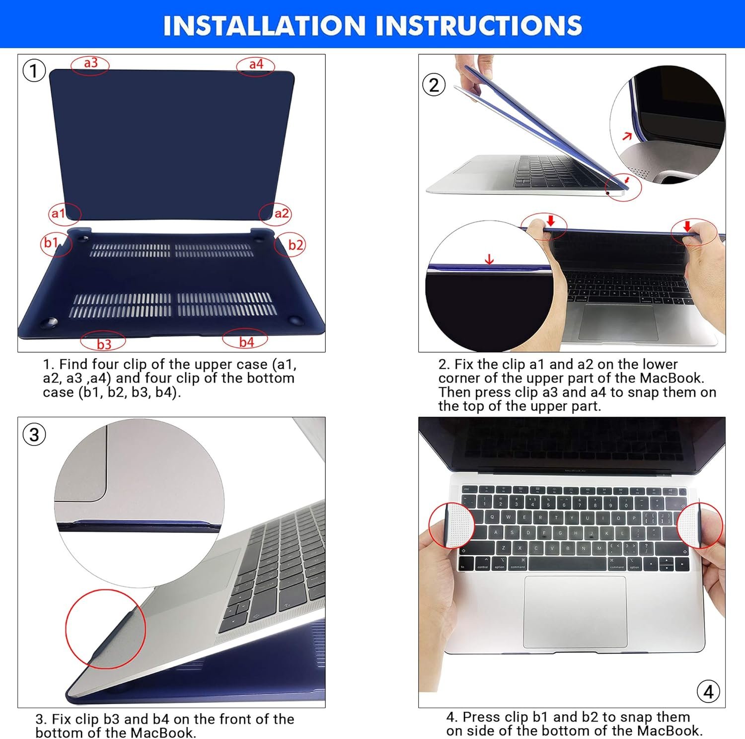 Encuentra cuatro clips en la cubierta superior (a1, a2, a3, a4); y cuatro clips en la carcasa inferior (b1, b2, b3, b4)