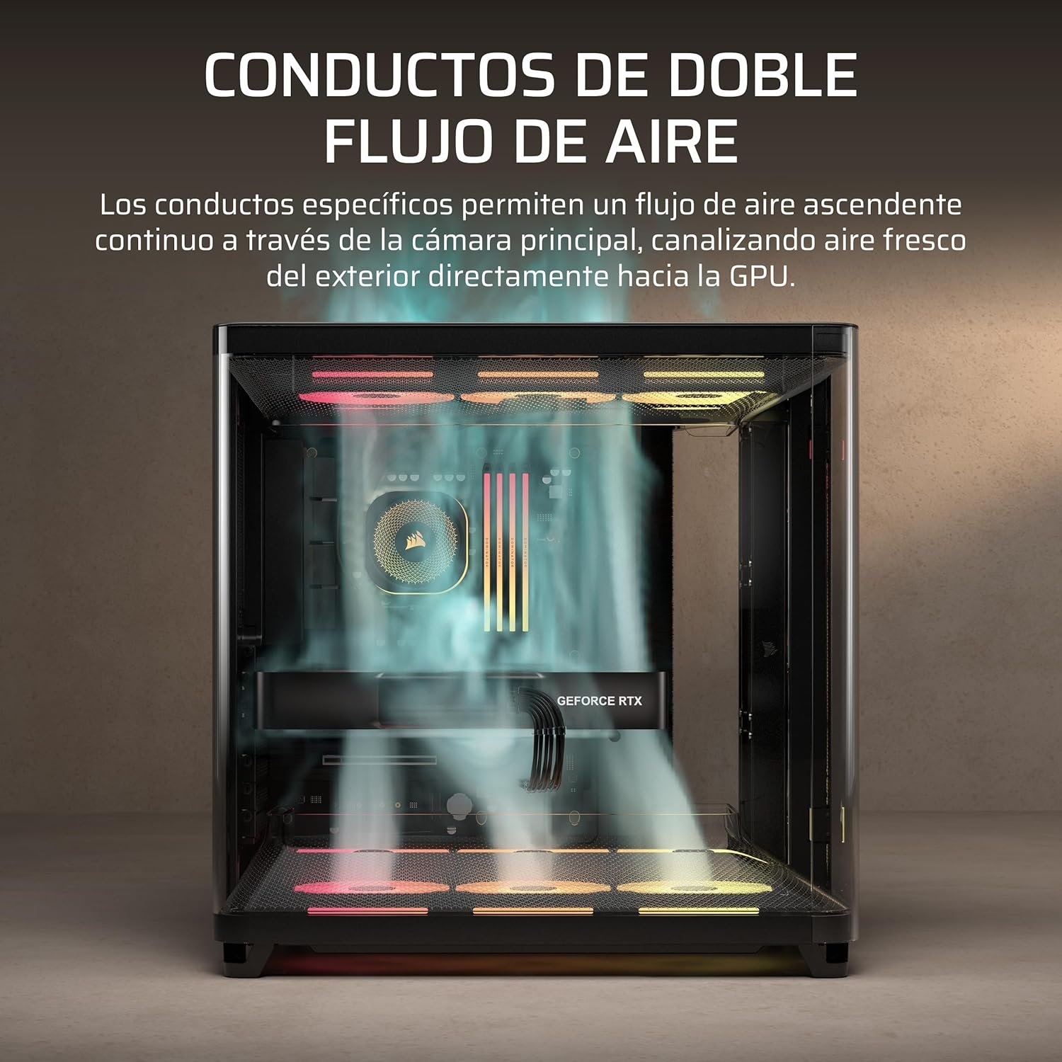 Air ducts – An innovative duct in the lower fan arrangement of the main chamber accelerates airflow by forcing it through a narrow channel. This increases airflow speed without increasing fan speed, improving cooling without generating more noise. This increases airflow speed without the need to increase fan speed, which improves cooling power without adding noise.