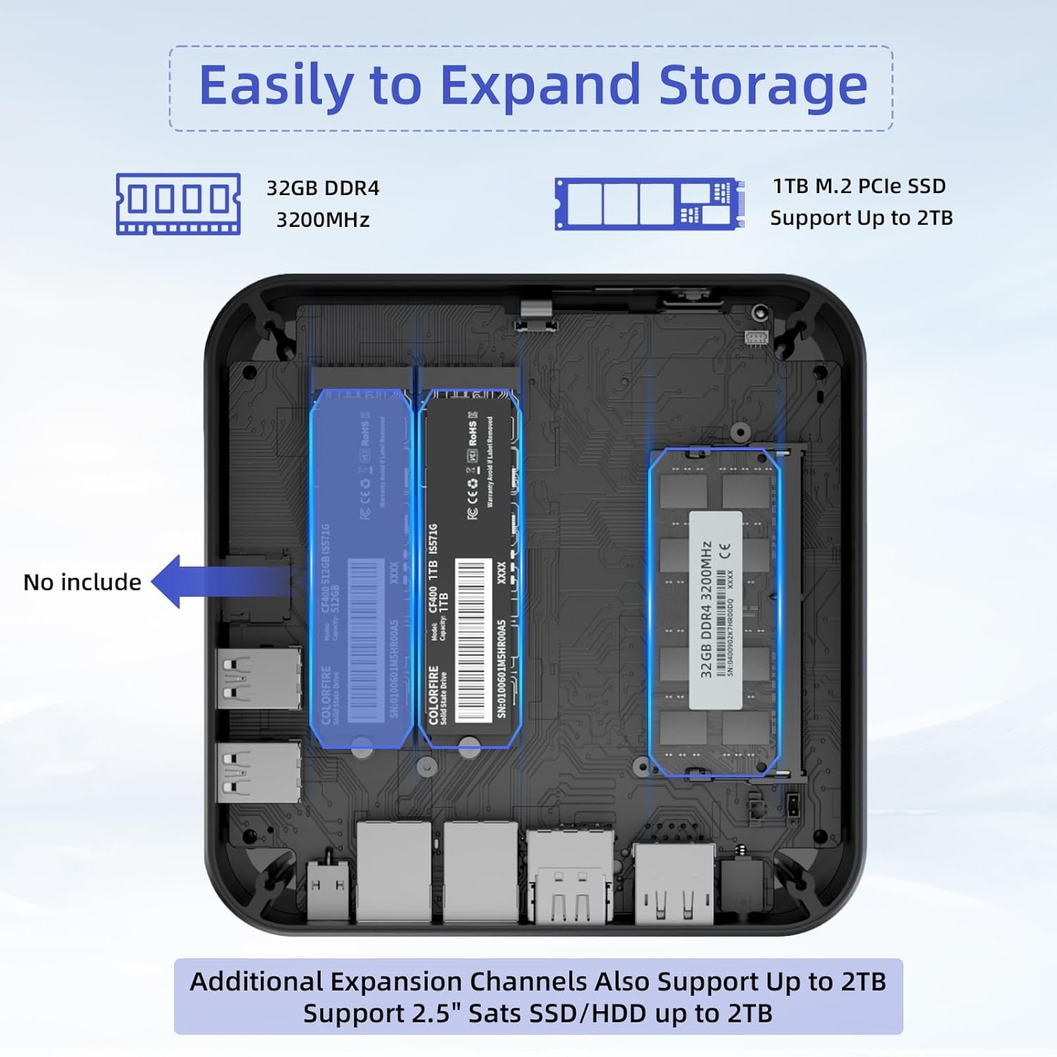 Fast Response, 32GB Running Memory: Only 14 x 14 x 4.5cm, 1.16lbs mini-PC 11, equipped with 32GB DDR4 RAM, 1TB SSD 30% faster than eMMC. Dual Rj45 Ethernet/Bluetooth 4.2, wifi 2.4G/5G, wifi module is M.2 2230 interface, dual-band uplink (2.4G/5G) and downlink can reach 600Mb/s. Customers can also replace a more advanced Wi-Fi module after purchase, and can also replace 4G LTE or 5G if they have special needs.