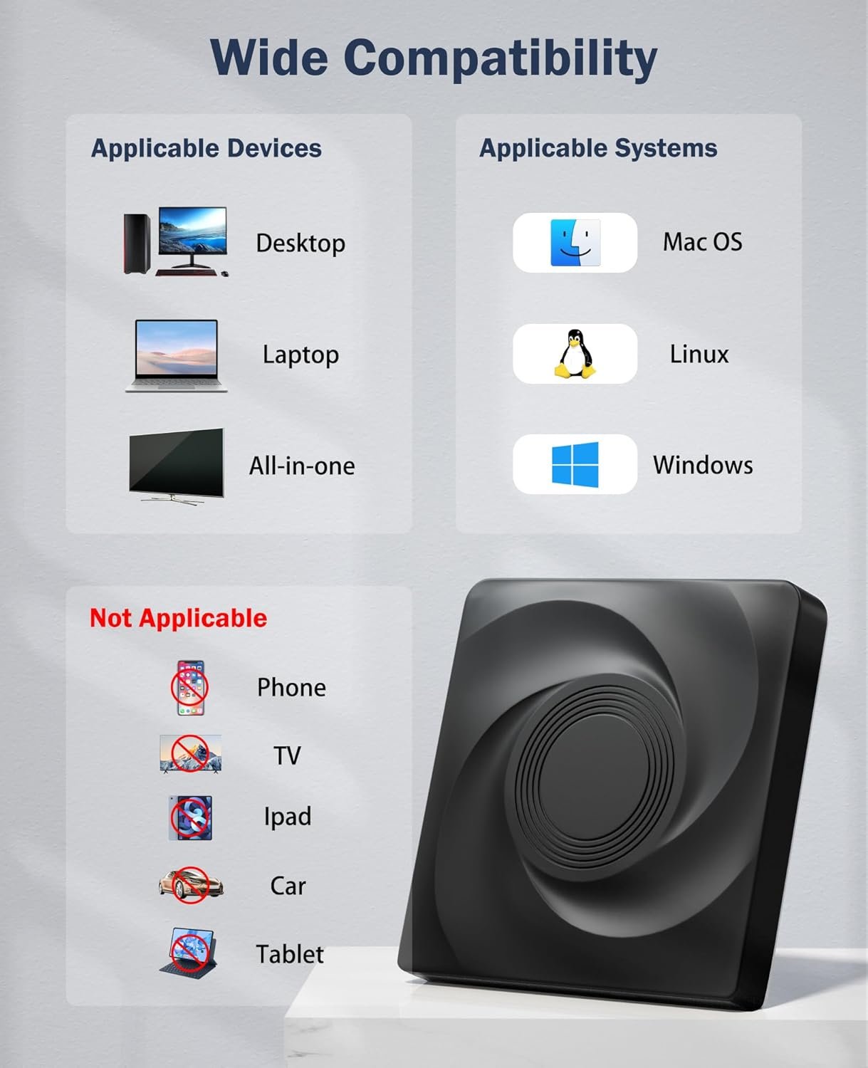 Wide Compatibility This external USB DVD/CD drive is designed to work perfectly with Windows (98/SE/ME/2000/XP/Vista/Windows 11/10/8/7), Mac OS, making it suitable for a wide range of PCs, laptops and complete computers.