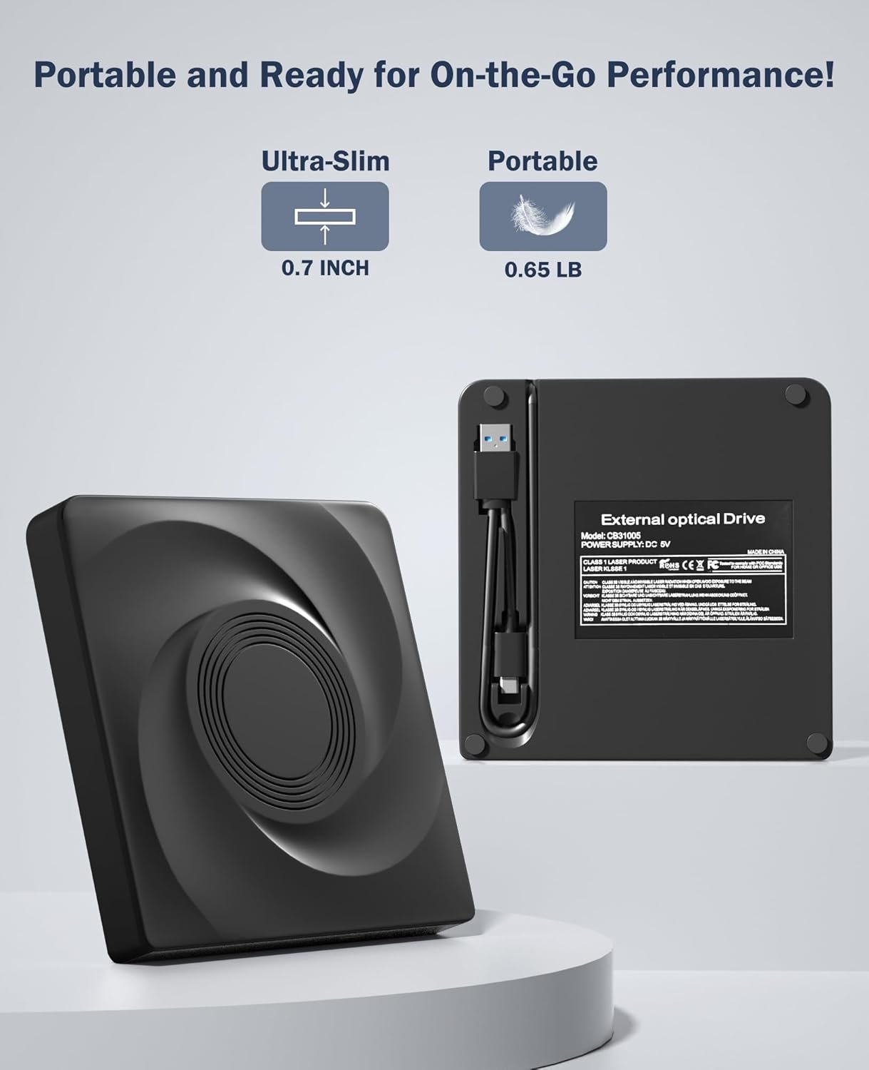 COMPACT & PORTABLE – Our slim and lightweight design is ideal for on-the-go use. Whether you are at home, in the office, or on the go, you can easily take this portable CD/DVD drive with you. Our high quality USB 3.0 external CD/DVD drive is the ideal solution for all your CD/DVD reading and writing needs, as convenient as an internal optical disc drive.