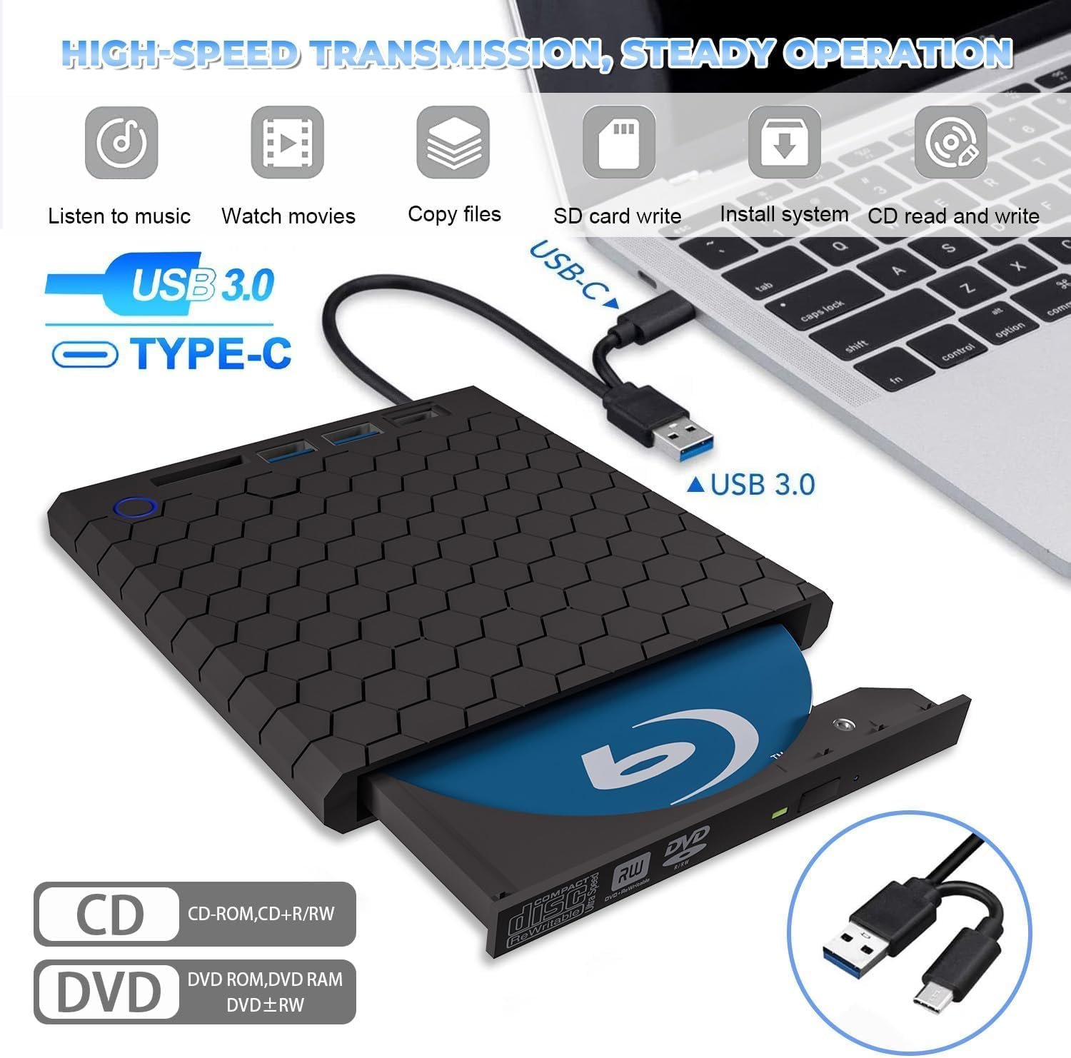 Compatibilidad universal: Este es un reproductor de CD/DVD/lector/escritor/reescritor/grabador externo completo. Es compatible con CD ±R / RW, CD-ROM, DVD ±R / RW, DVD-ROM, DVD-RAM, VCD. Esta unidad de disco externa admite diferentes dispositivos como Macbook, iMac, computadora portátil, escritorio, PC y computadora portátil, etc. Es compatible con Windows 11/10/8/7/XP, Vista 7/8, Linux, Mac OS 10.6 o superior.