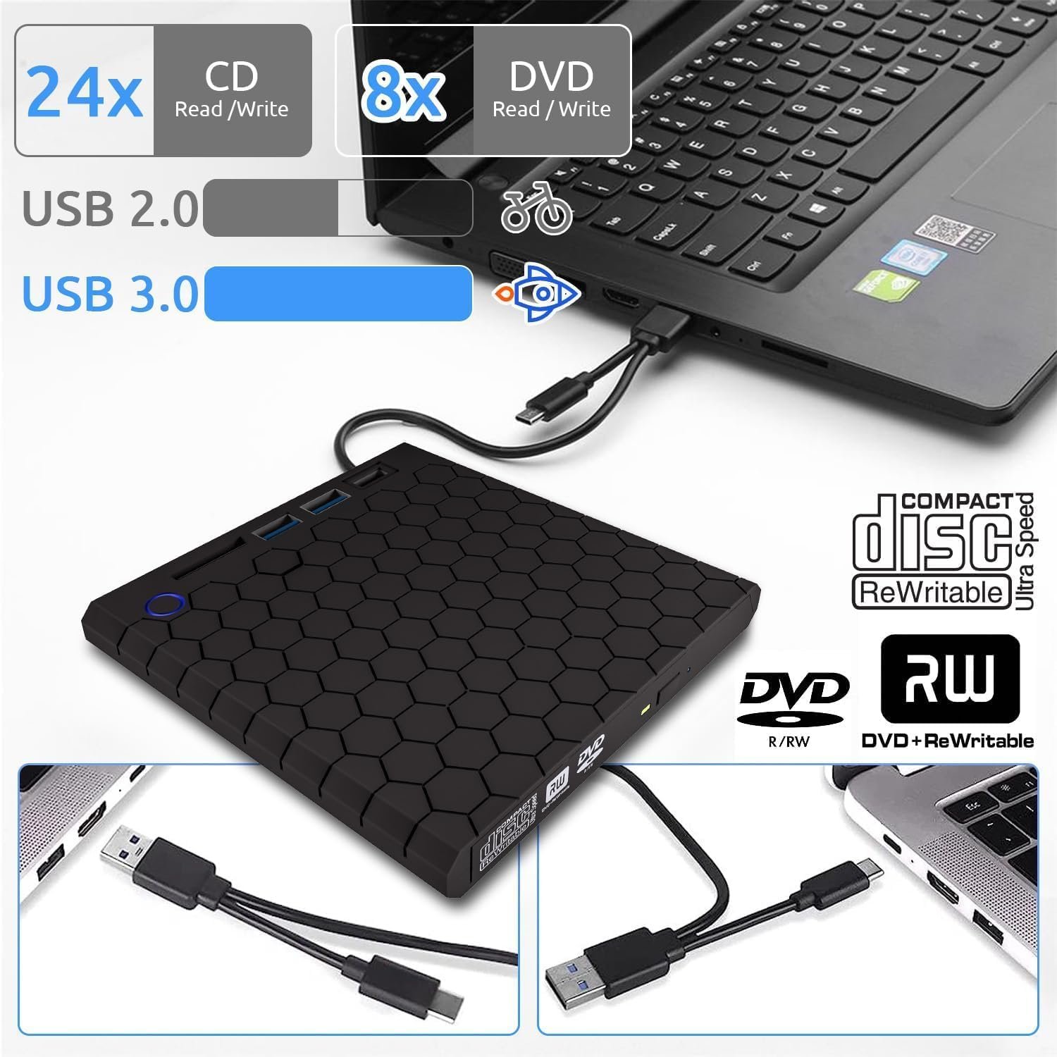 2 en 1 USB & Tipo-C: El cable de datos integrado de la unidad de CD/DVD externa con interfaz USB y tipo C doble, facilita la conexión del reproductor de DVD externo en diferentes computadoras portátiles y PC sin adaptadores. Y no se preocupe por perder cables de datos. También hemos equipado deliberadamente un cable de alimentación, por lo que algunas computadoras con una fuente de alimentación insuficiente no tienen que preocuparse por no poder usarlo