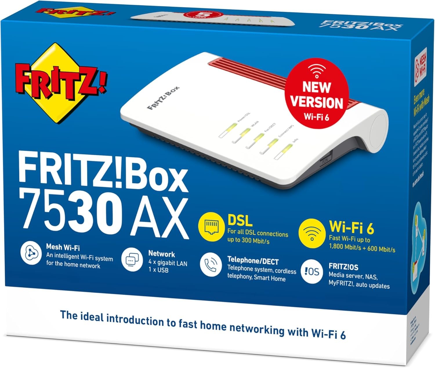 Contents: FRITZ!Box 7530 AX, 4 m DSL connection cable, 1.5 m LAN cable, power supply, quick installation guide in Spanish