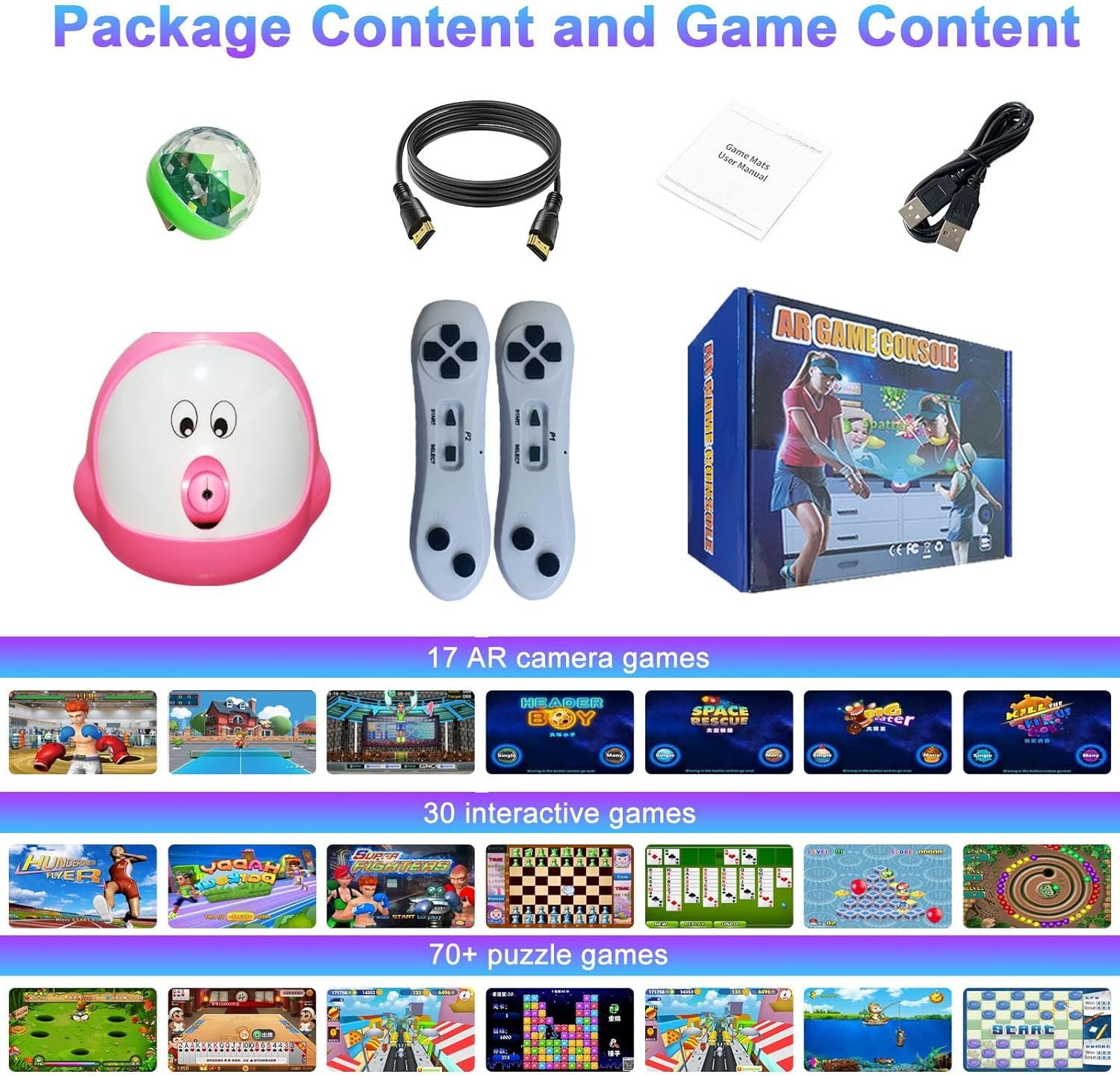 【17 Camera AR Games】This video game console for kids and adults comes with 17 popular AR camera games, you can play games freely without the game controller. Through the HD camera, you can project your photo on the TV as the role of the game that will make you immerse yourself in the game. You can also save the camera game photo as record.