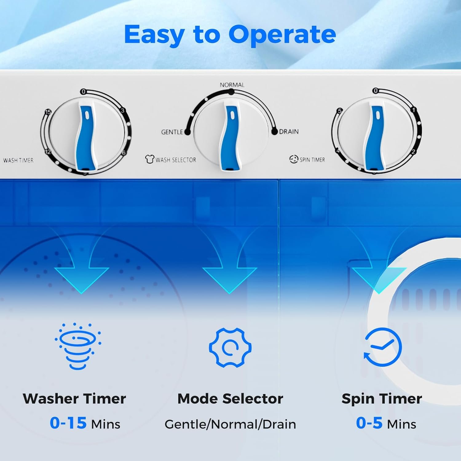 User-friendly Operation The washing machine is designed with 3 individual knobs, giving you complete control over washing time, modes and spin time, making laundry a breeze. It offers gentle and normal wash cycles for different items of clothing such as T-shirts, socks, pants and underwear.