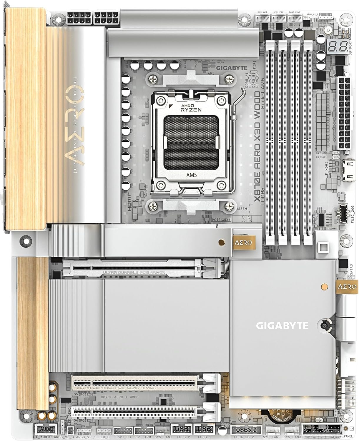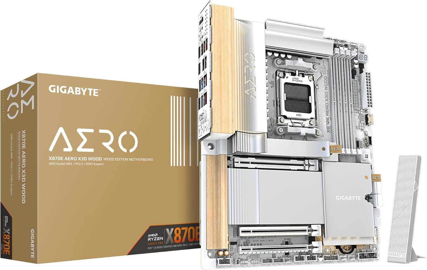 GIGABYTE X870E Aero X3D Wood Motherboard – Supports AMD Ryzen 9000 Processors, 16+2+2 Phase Digital VRM, up to 9000Hz DDR5 (O.C.), 2xPCIe 5.0 + 2xPCIe 4.0, Wi-Fi 7, 5GbE LAN, USB 4