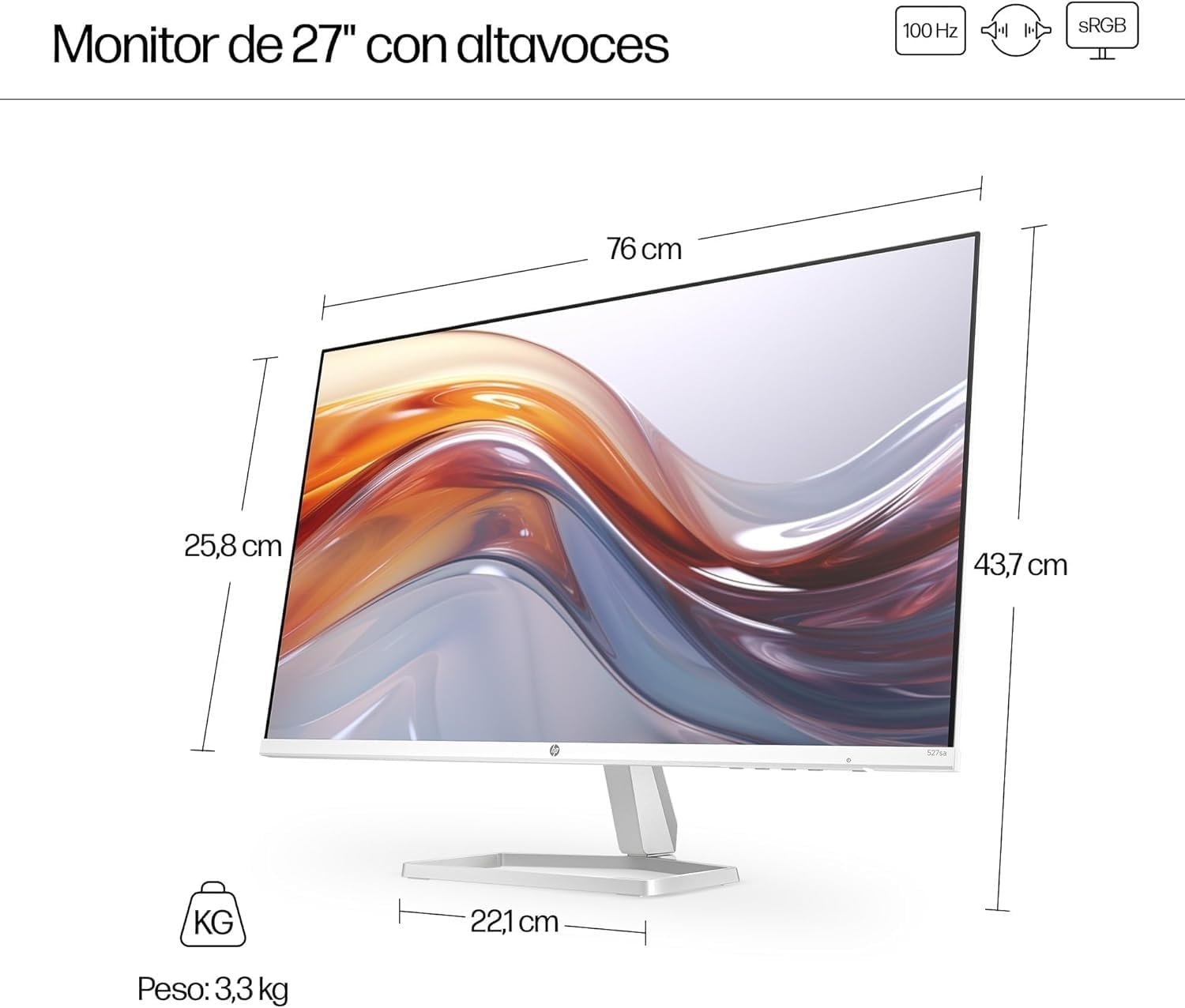 27-inch IPS panel, Full HD (1920 x 1080p) at 100 Hz, with a diagonal of 68.5 cm, field of view 16:9, 300 Nits, 5ms response time, 1500:1 contrast, 99% sRGB color volume