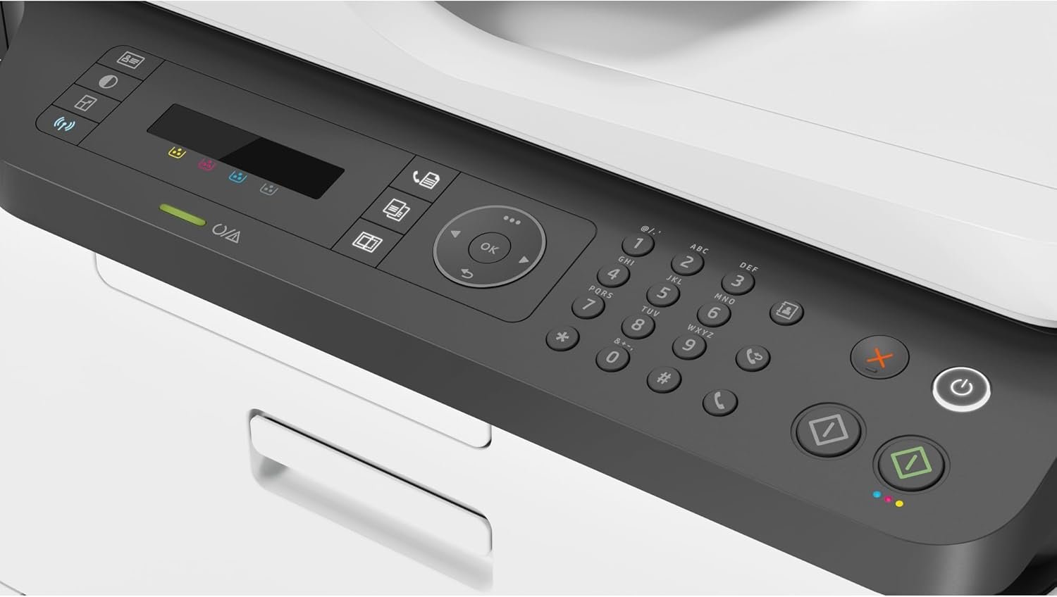 Manually print, copy, scan and fax documents with flawless results across all pages; print speed is 18 ppm black and 4 ppm colour