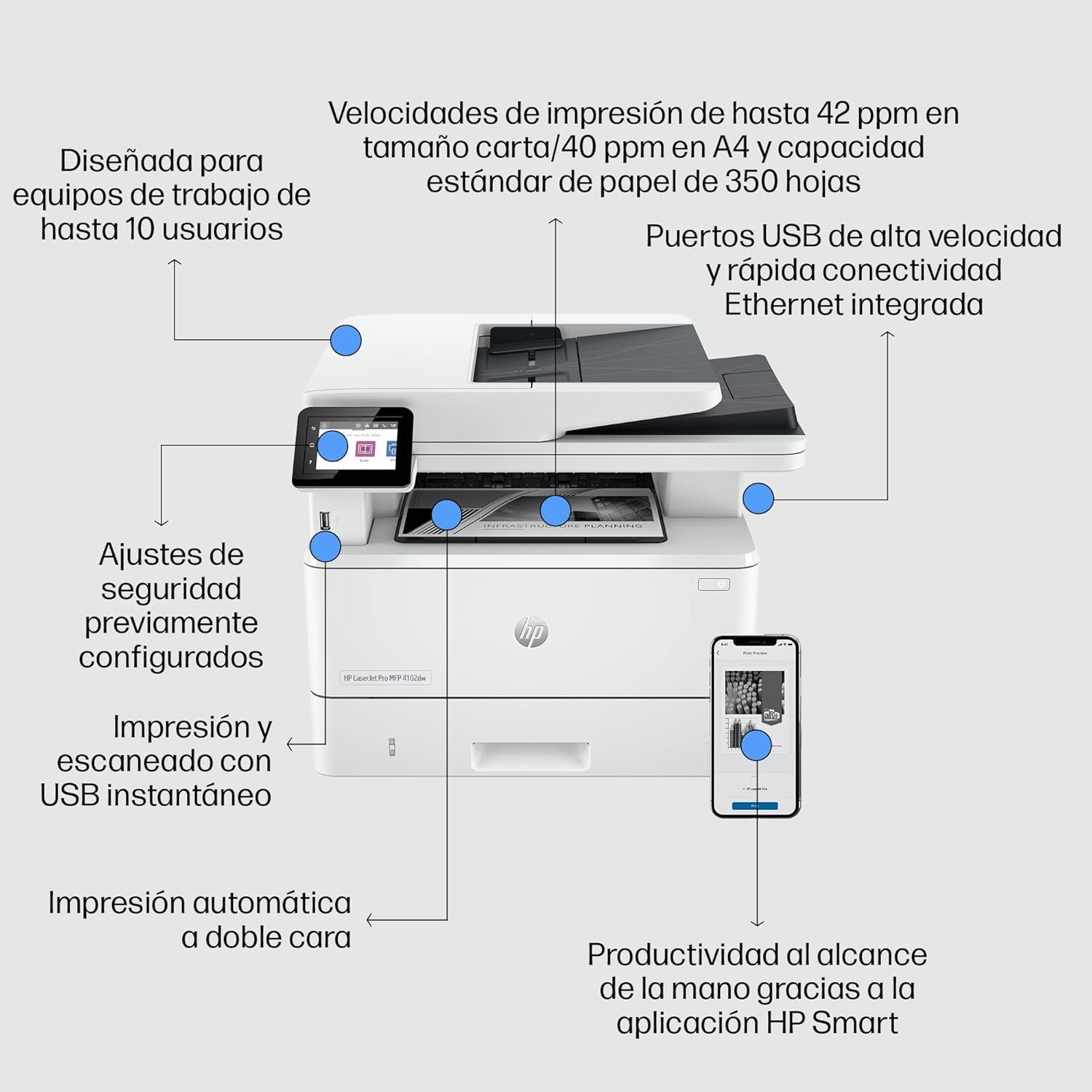 Reliable connectivity thanks to dual-band Wi-Fi, Bluetooth, Wi-Fi Direct and Gigabit Ethernet network, 1 rear USB host, USB 2.0 high-speed port, HP Smart App, Apple AirPrint and Mopria, HP Wolf Security