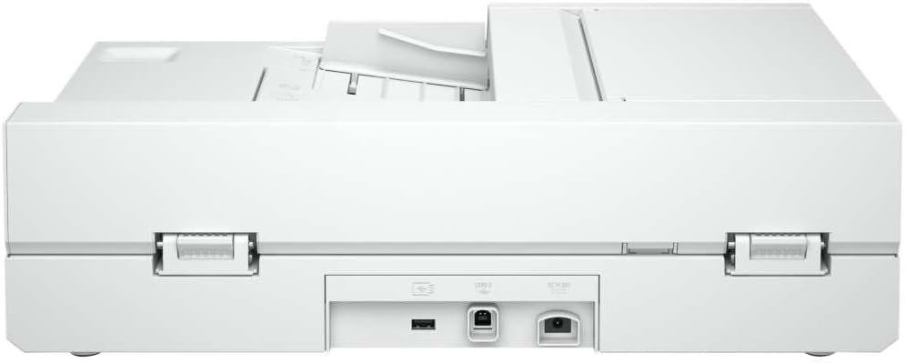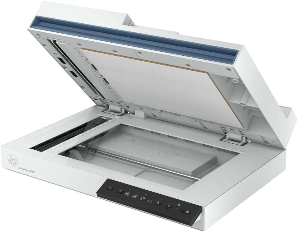 The design of the HP Scanjet is compact, modern and square, with blue accents contrasting with a satin matte white, making it an elegant design object for your space