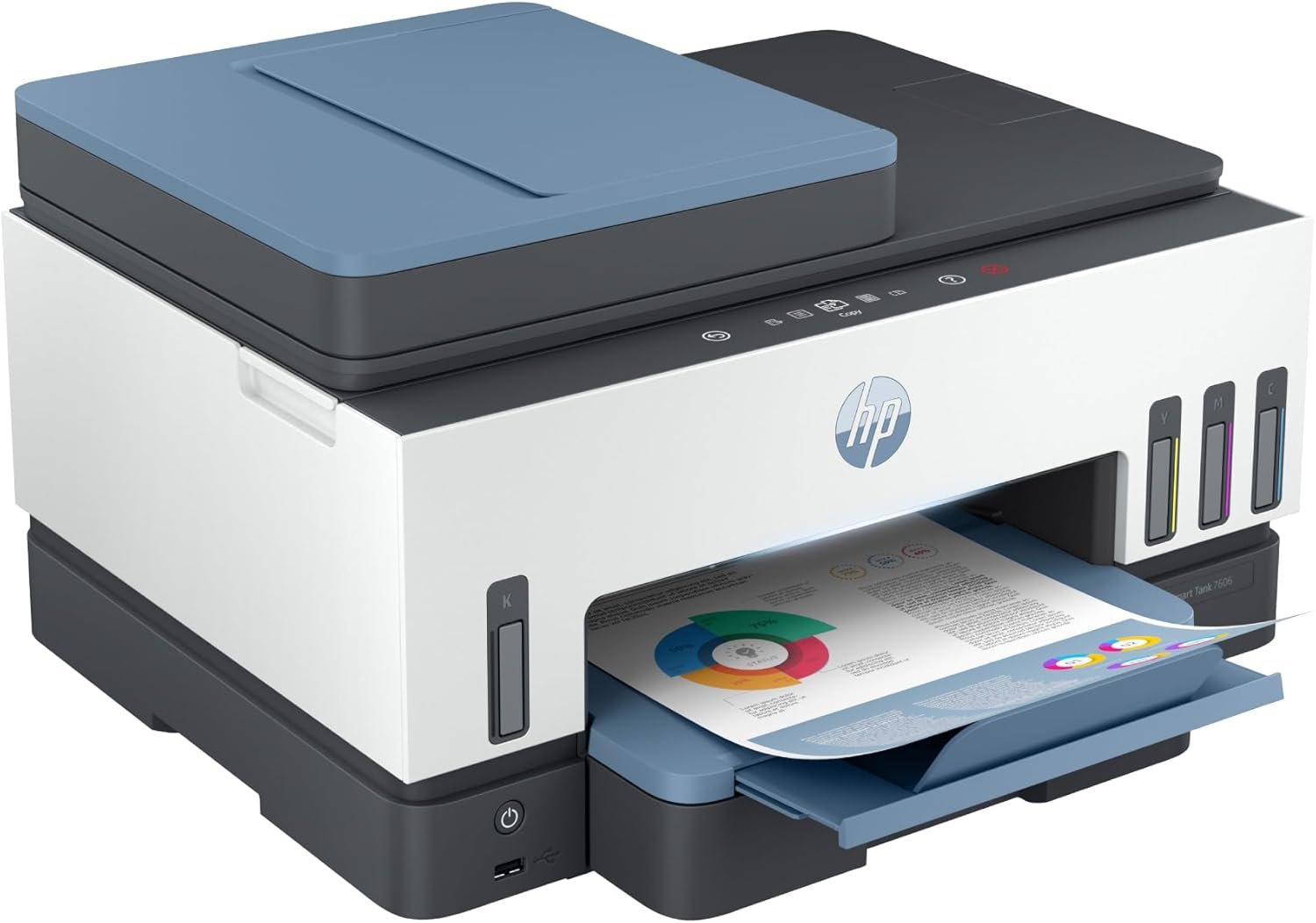 The printer has reliable connectivity thanks to dual-band Wi-Fi with auto-reset, Wi-Fi Direct, Ethernet, USB 2.0, Wireless, HP Smart App, Apple AirPrint and Mopria