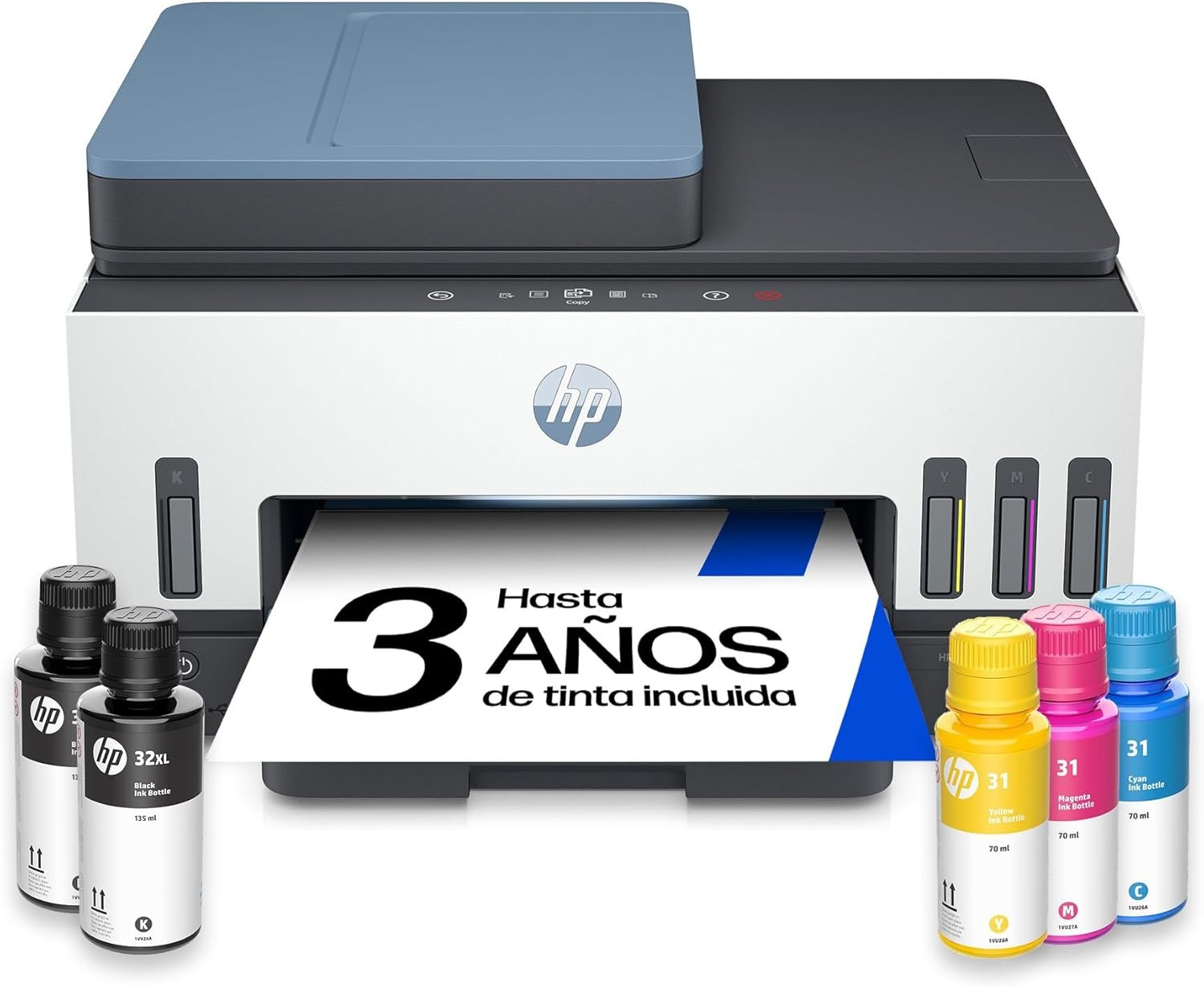 This printer is compatible with HP Original Ink Bottles 1VU26AE Original Ink Bottle HP 31 Cyan 70ml, 1VU27AE Original Ink Bottle HP 31 Magenta 70ml, 1VU28AE Original Ink Bottle HP 31 Yellow 70ml, 1VV24AE Original Ink Bottle HP 32XL Black from 135 ml oz, 6ZA17AE Printhead HP 6ZA17AE black