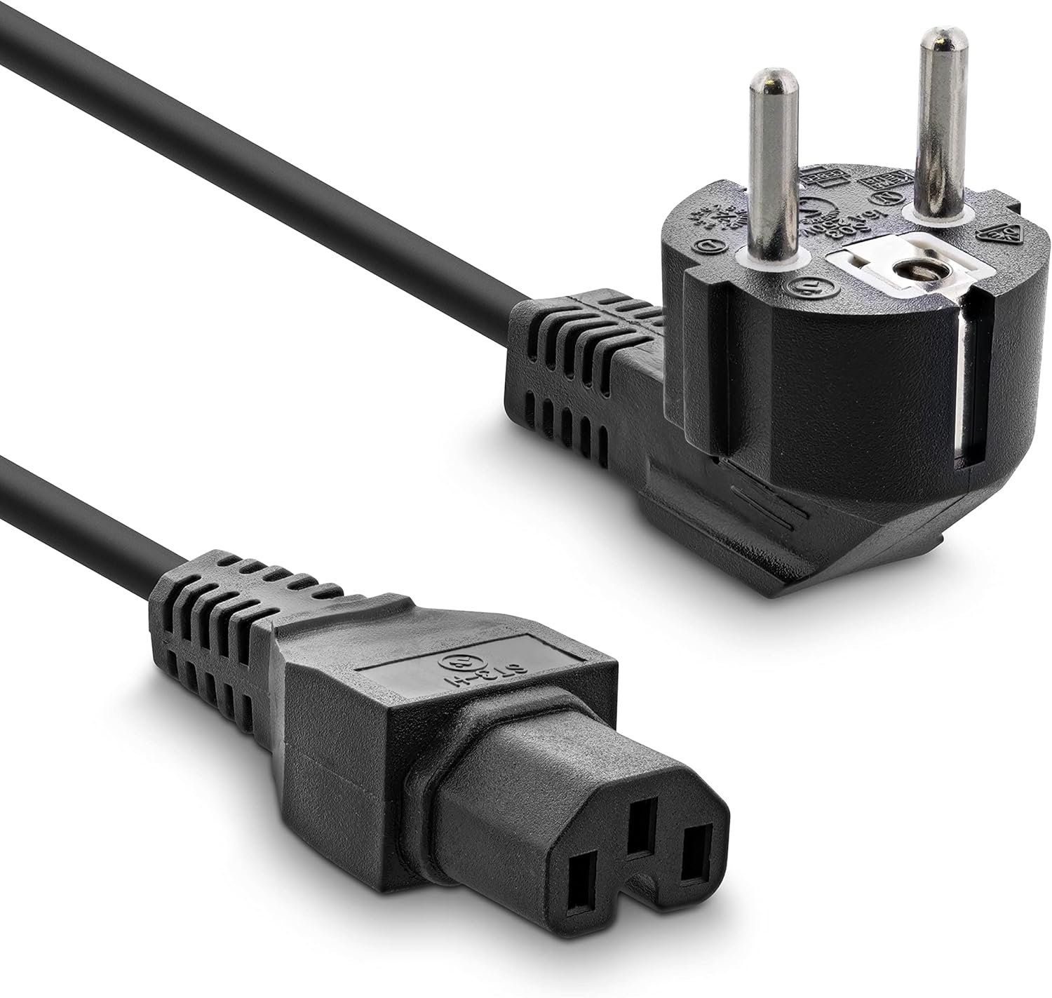 Electrical power cable with IEC 60320 (C15) plug and Schu.ko plug. EEC-7/7 10 A/250 V with 2 poles and ground contact. The C15 connector is suitable for operating at high temperatures (120 C) and suitable for powering kitchens, hoods, industrial vacuum cleaners, ironing irons, water heaters and others. Plug (Schu.ko). CEE 7/7 to 90 Connector (socket) IEC-60320 C-15 Cable 3 conductor H05V2V2-F (3 x 1 mm) VDE, ENEC certificates. Moulded connectors (pre-assembled).