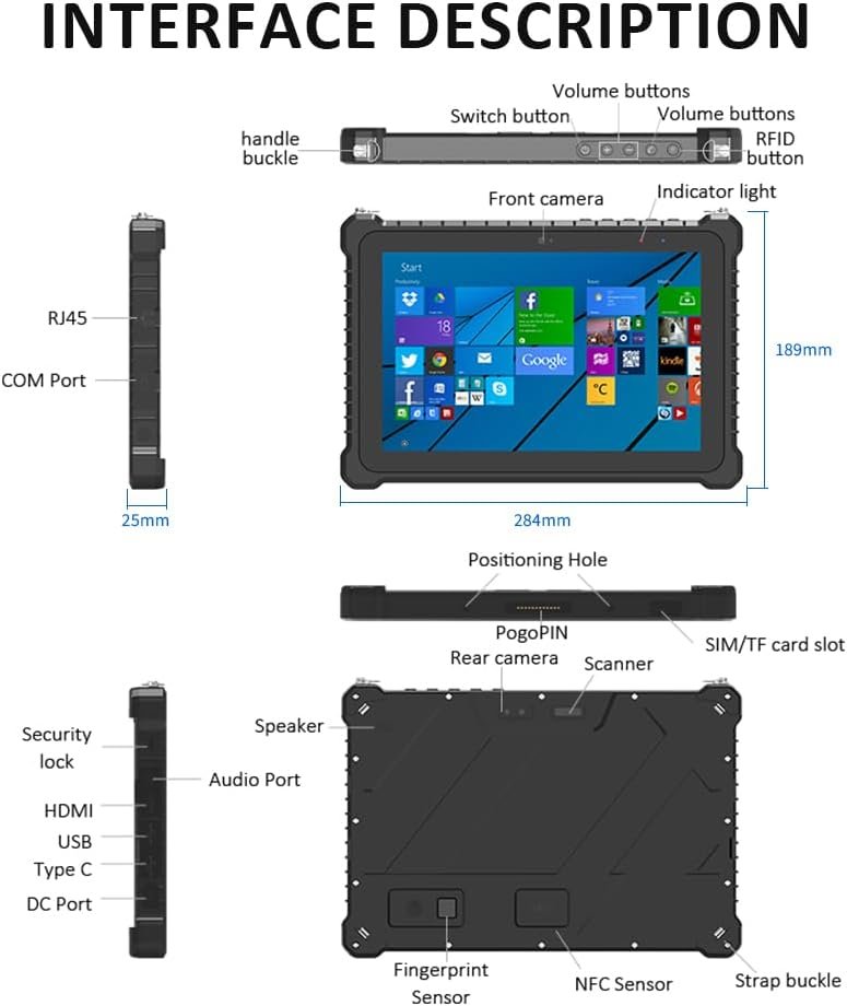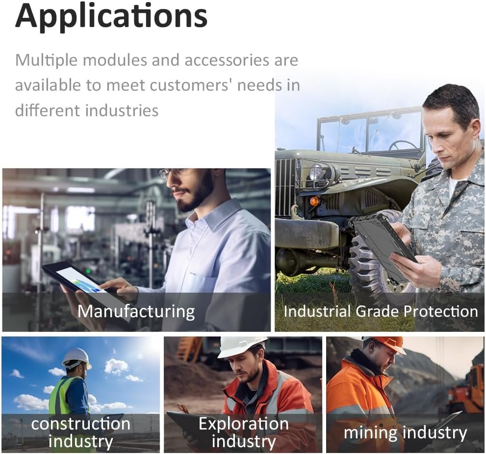 MULTIPLE APPLICATION — The rugged field tablet is equipped with a variety of professional interfaces to meet the needs of various application scenarios. The products are strong and intelligent, thin and light, and highly efficient in protection. They are widely used in intelligent industry, warehousing and logistics, construction engineering, drones, automotive services, vehicles, finance, education, intelligent equipment and other fields.