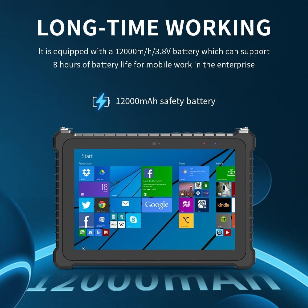 EXCELLENT BATTERY DURABILITY: Industrial tablet PC with built-in intelligent polymer lithium-ion battery, 12000mAh / 3.8V, the rugged touch screen tablet can support 10 hours of use. The energy-efficient design allows for long time of field work, without worrying about data loss in the field. An essential production tool for getting jobs done, ideal for enterprise mobile work.