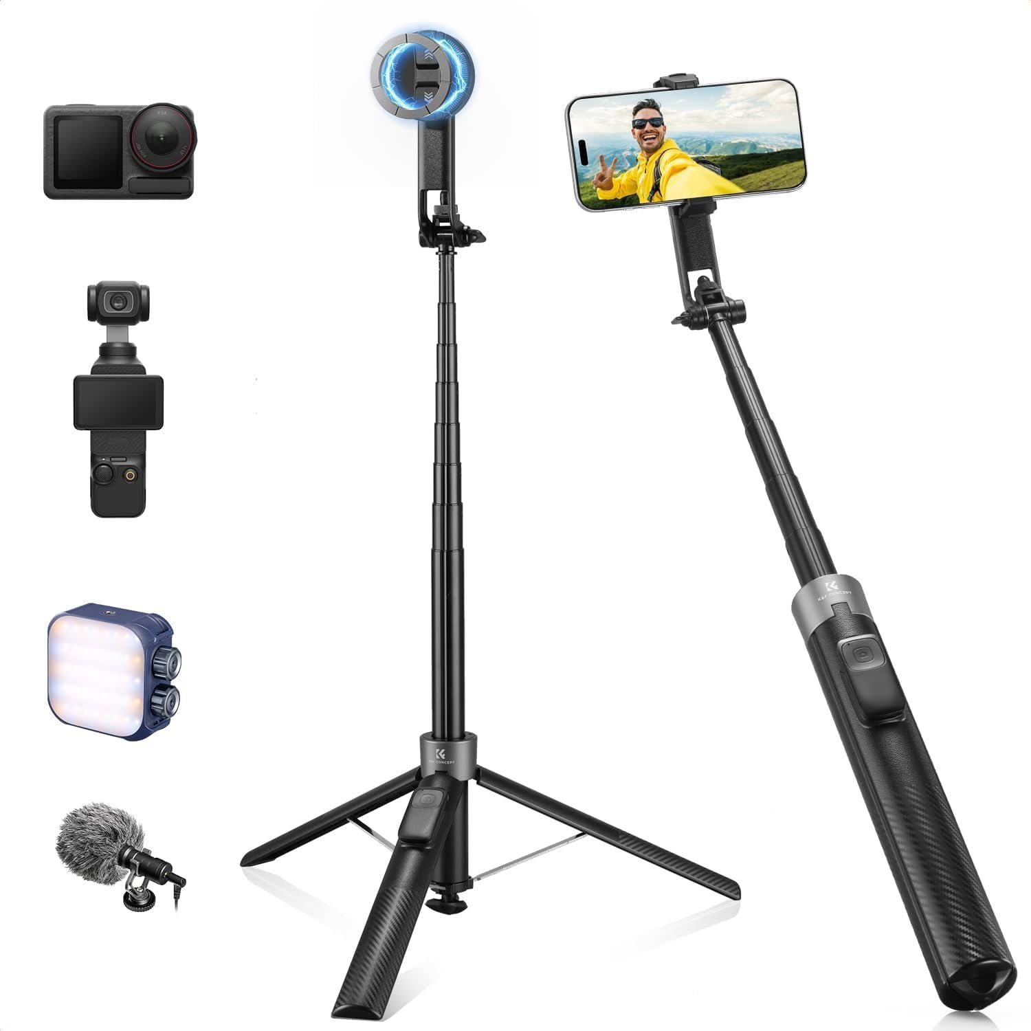 3 in 1 Design: K&F CONCEPT Phone Tripod features a magnetic system and a clip to hold your phone, compatible with a standard 1/4″ screw, for quick mounting and recording. This selfie stick securely holds any smartphone and its accessories.