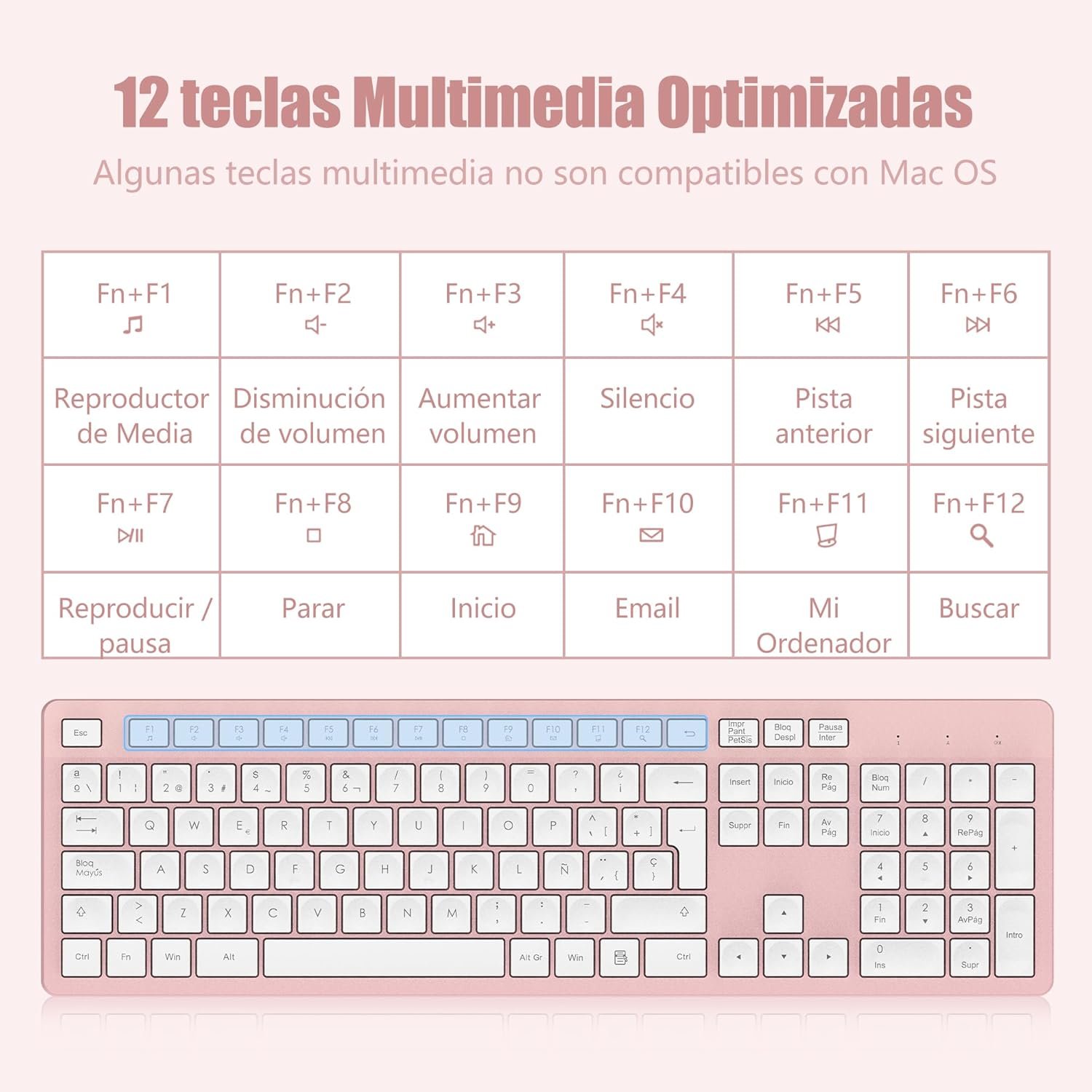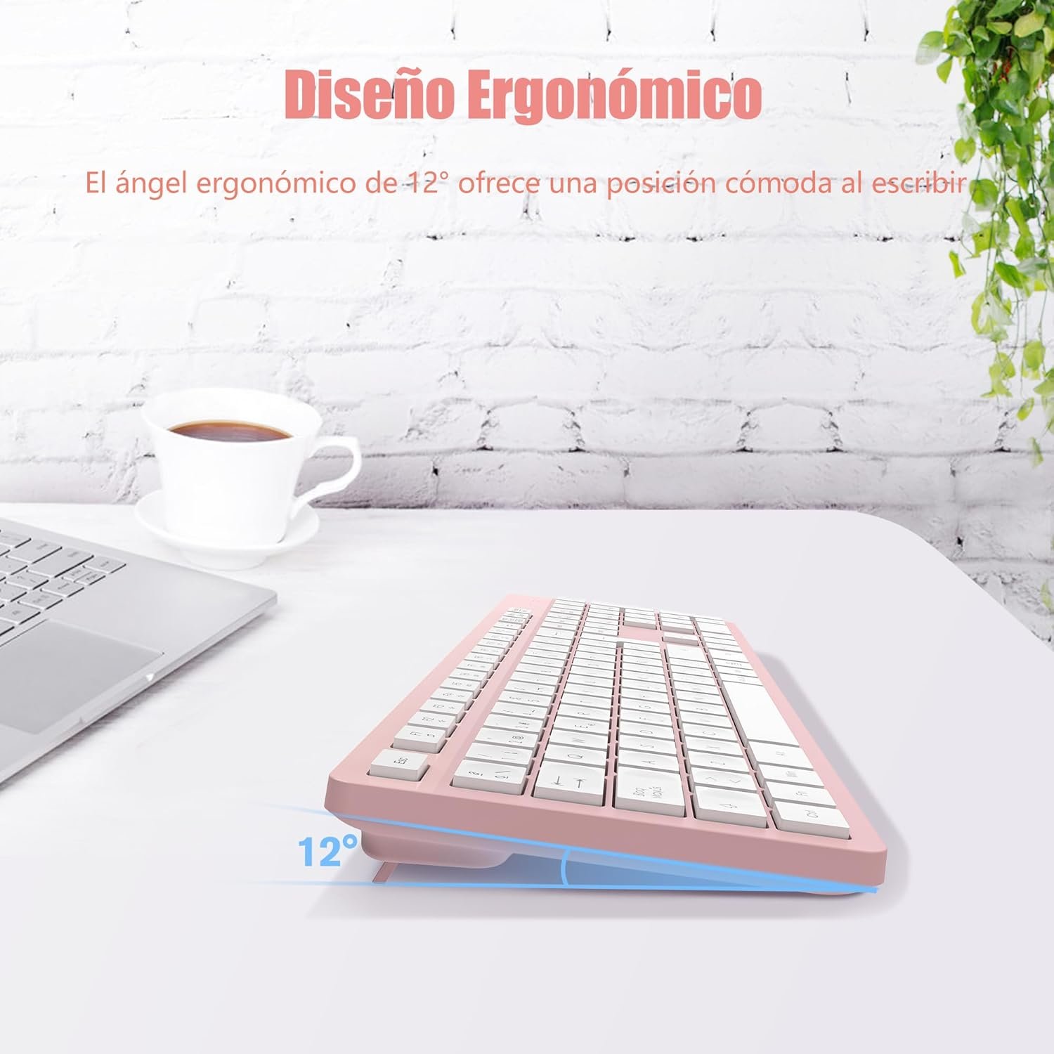 LeadsaiL Wireless Keyboard Pink QWERTY Spanish Keyboard USB Ergonomic Full Size Wireless Numeric Keypad, 12 Multimedia Shortcuts for Windows Mac PC Laptop