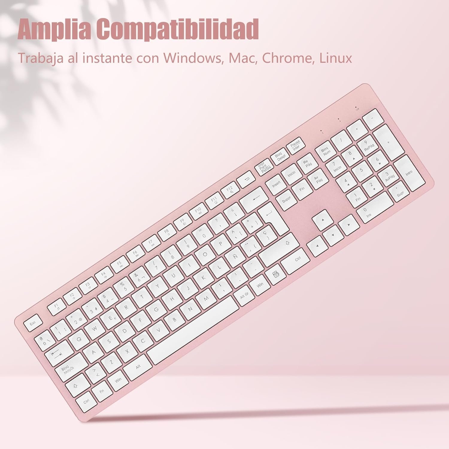 Teclado inalámbrico sobre fondo rosa con iconos que indican la compatibilidad con los sistemas operativos Windows, Mac, Android y Linux. El texto en español dice «Compatible con más Dispositivos