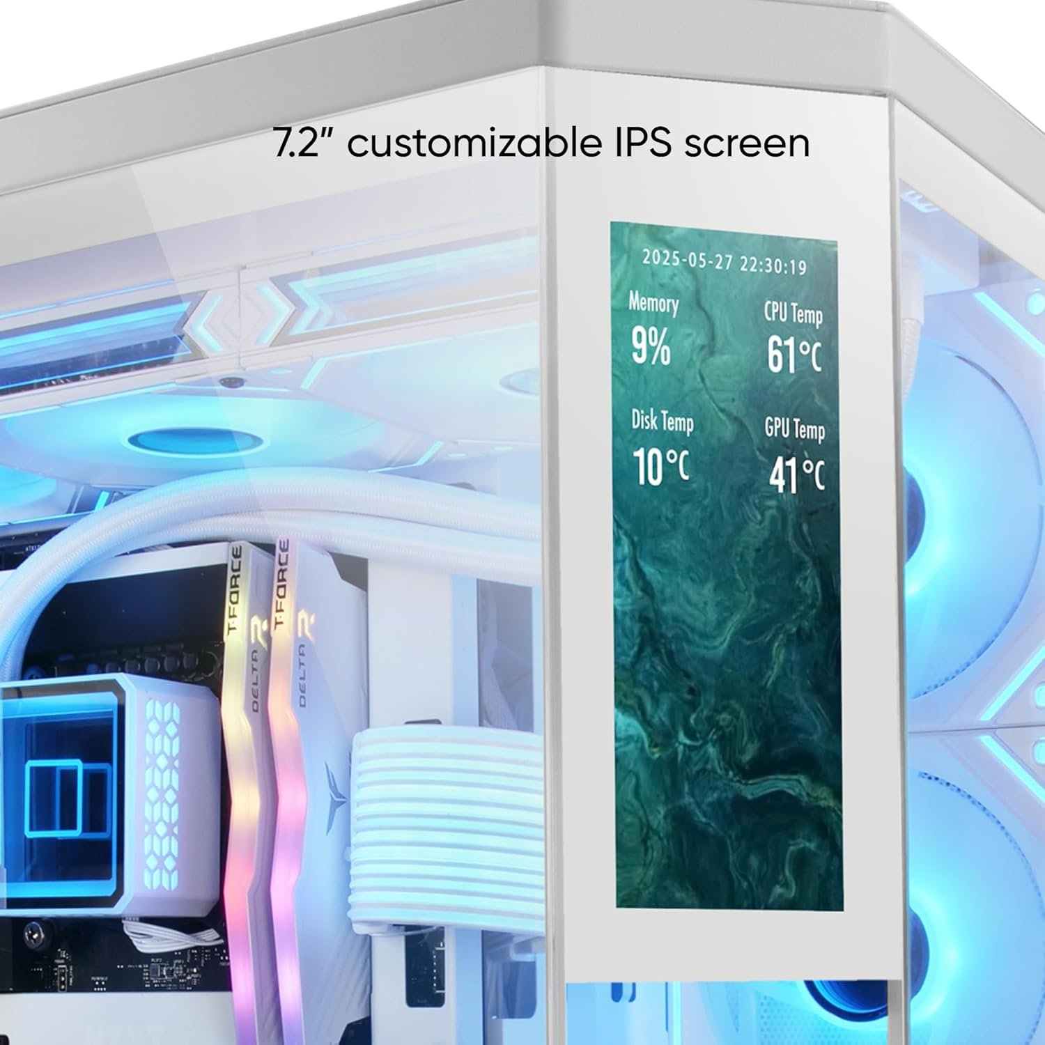 Integrated 7.2″ IPS Display: The ATX MC-3TCORELCD turns your tower into a control panel thanks to its 7.2″ IPS screen integrated in the central glass; monitors temperatures and displays images, animations and videos thanks to its control software