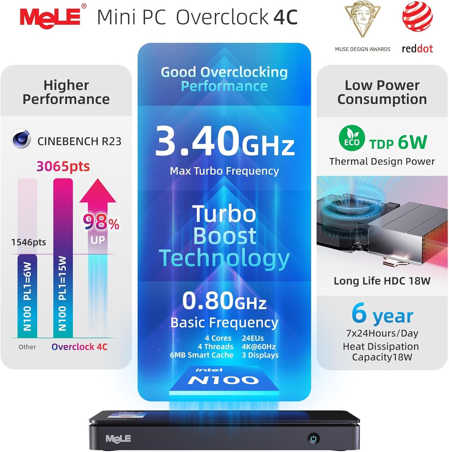 Rich interfaces, fast speed – The MeLE Overclock 4C offers a PCIE3.04 for the M.2 interface, with a maximum speed of up to 3940MB/s. Any 4 times more than other Mini PCs. At the same time, this compact PC offers rich interfaces, including USB2.01, USB3.0 Gen2 2, USB-C 3.2 Gen21, Micro-SD USB2.01 slot, HDMI 2.02 and 1* RJ45 Gigabit Ethernet port.