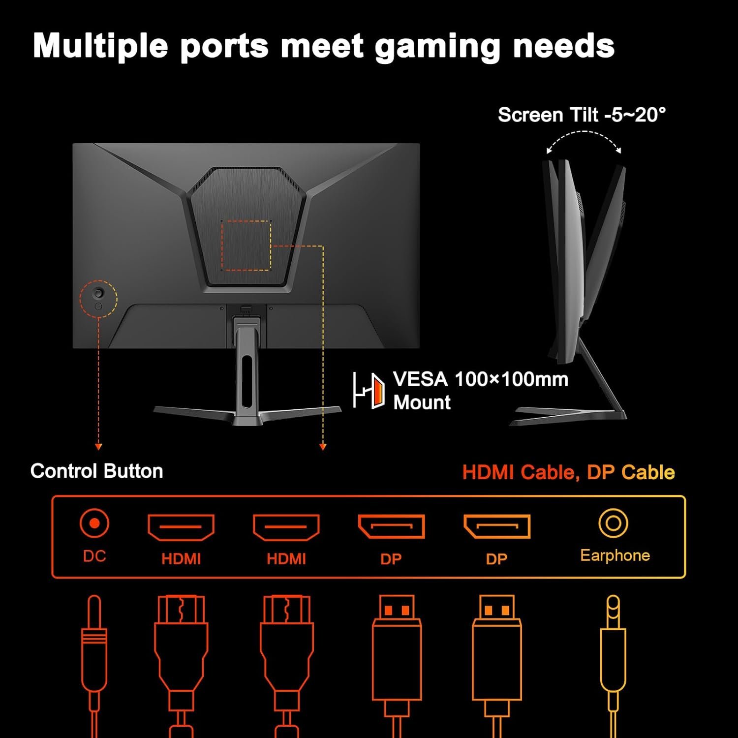 Future-ready connectivity: HDMI 2.0 and two DP 1.2 ports support 2K monitor passthrough at 120Hz for consoles and PCs. The 100x100mm VESA mount allows ergonomic configurations, with -5° to 15° tilt for a perfect viewing angle.