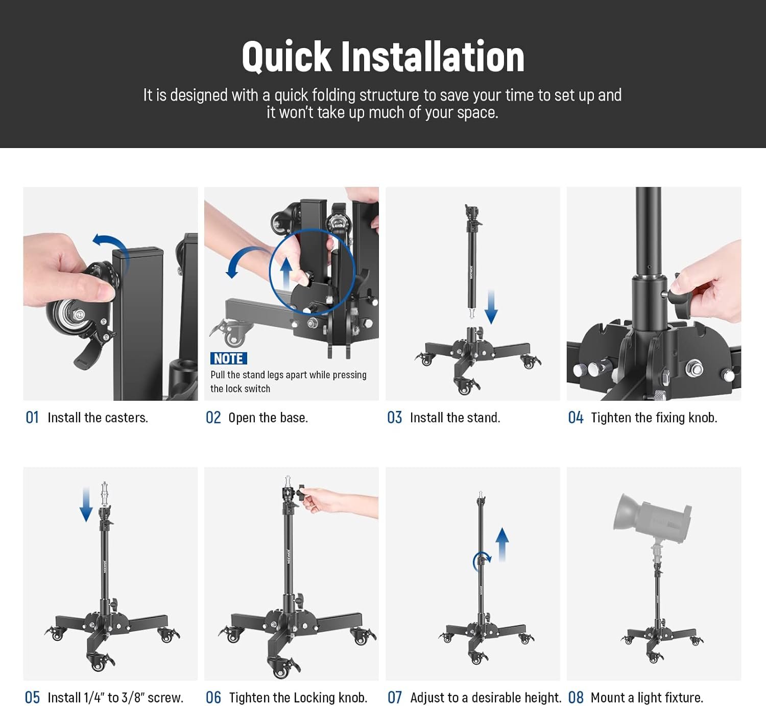 Stable Tripod Base The metal tripod base makes it more stable and strong with a maximum load capacity of 22lb/10kg. Equipped with 3 rotating metal wheels, wear-resistant, easy to install, move smoothly. Each impeller has a lock to fix the bracket firmly in place. Note: Install the rollers before using the light tripod