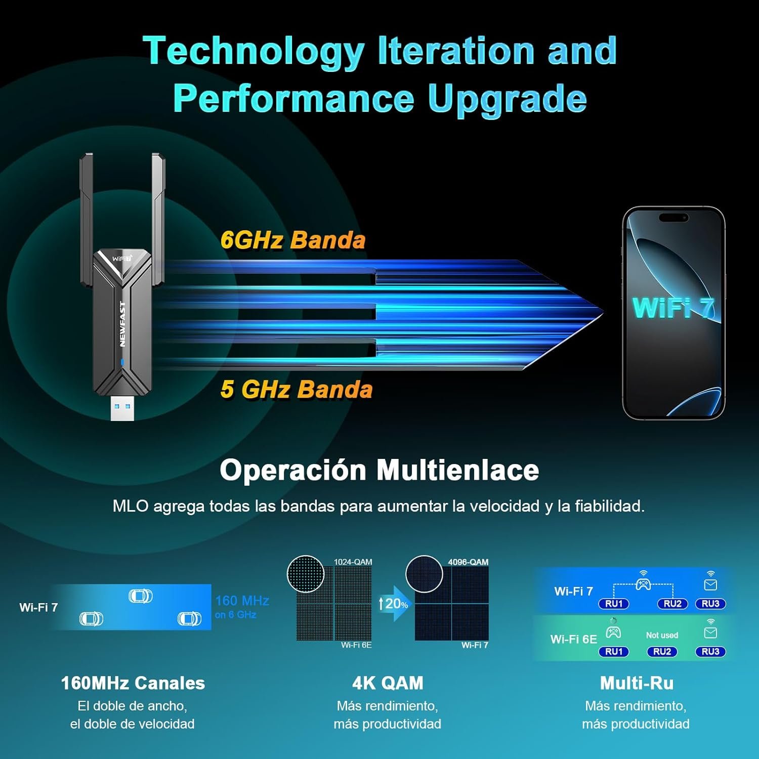 【Ultra-low Latency & High Reliability】 Multi-Link Operation (MLO) technology transmits data simultaneously over multiple bands (2882Mbps on 6GHz, 2882Mbps on 5GHz and 574Mbps on 2.4GHz), which reduces delay and ensures stable connections for games, virtual reality and video conferencing. WiFi 7 Dongle, advanced OFDMA and MU-MIMO technologies to efficiently manage multiple devices at once, ideal for smart homes, offices, or crowded areas with minimal congestion.