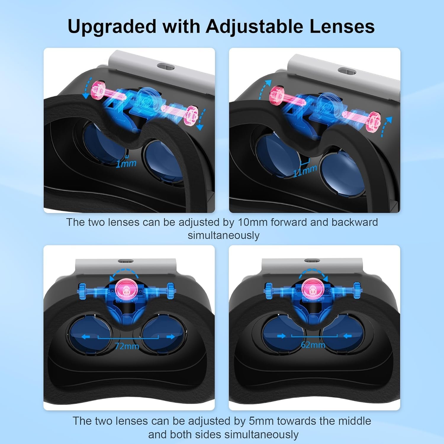 Upgraded Switch VR Headset The headset is upgraded with adjustable lens, the viewing window is improved by 20% and higher definition, you can adjust the switch lens left/right and forward/reverse to allow the picture to align for you, which will bring you a mass immersive visual experience.