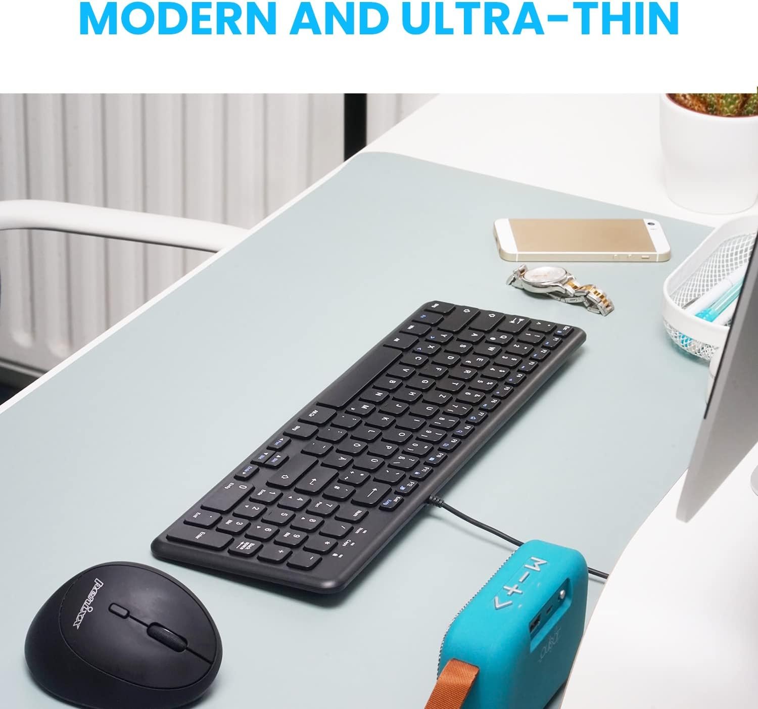 Modern chiclet keyboard: space between all keys to prevent typing errors and with a sleek design and built-in numeric keypad; Keyboard dimensions: 367 x 121 x 18 mm