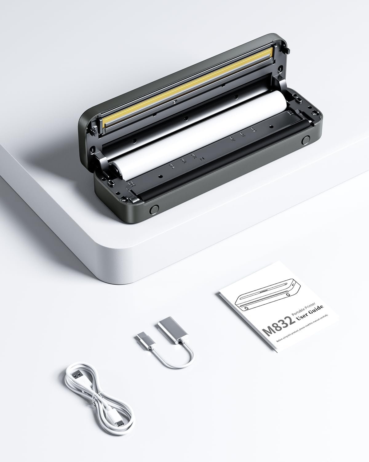 EASY TO USE & HIGH DEFINITION PRINTING: M832 travel thermal printer is compatible with Android and iOS mobile phones (via Bluetooth) and Windows 10/11 and MacOS laptops (via USB cable), the resolution is 300dpi, using high-quality thermal paper, instant printing is the best, smooth and clear paper, no longer need to worry about blurry printing, perfect for offices, schools, travel business and home use