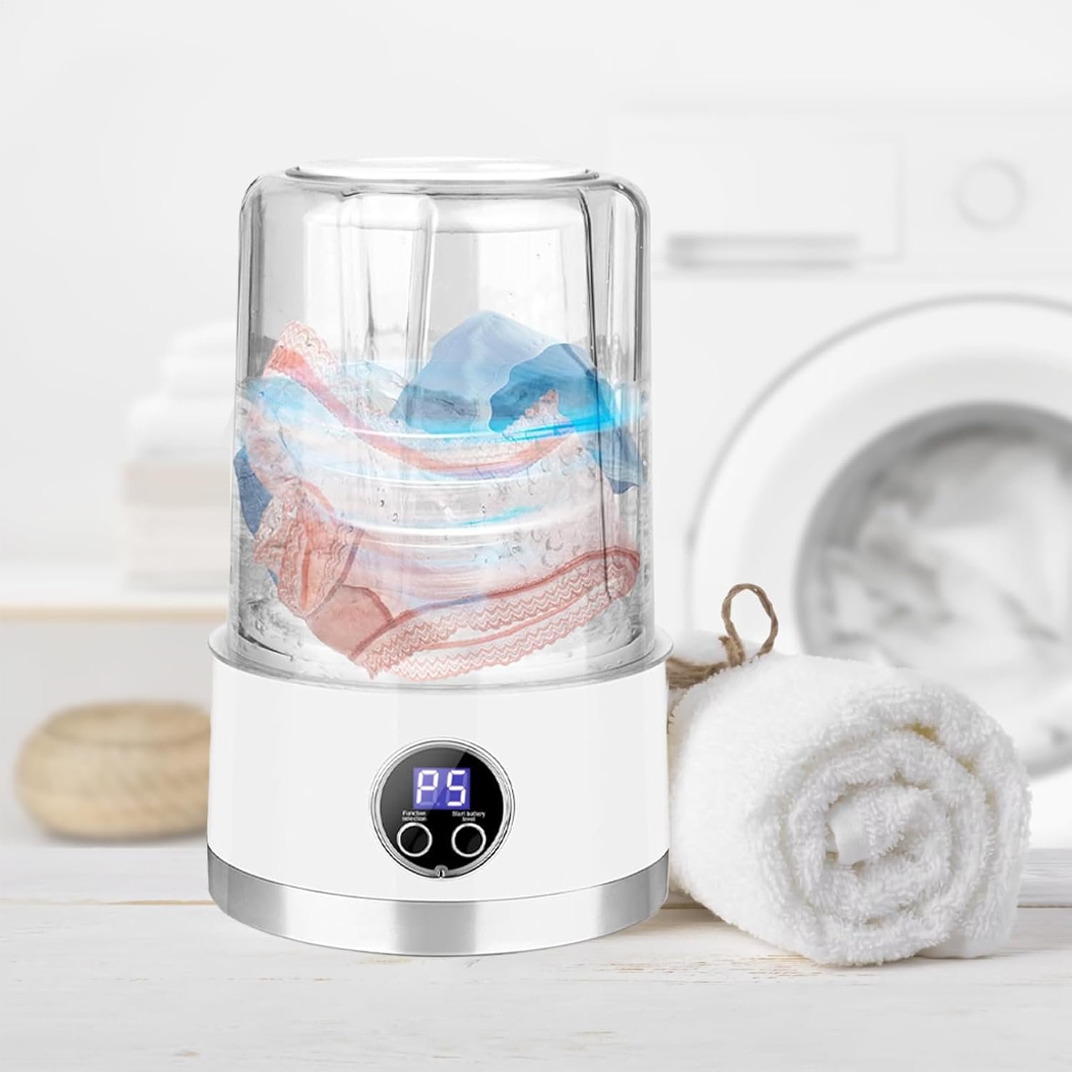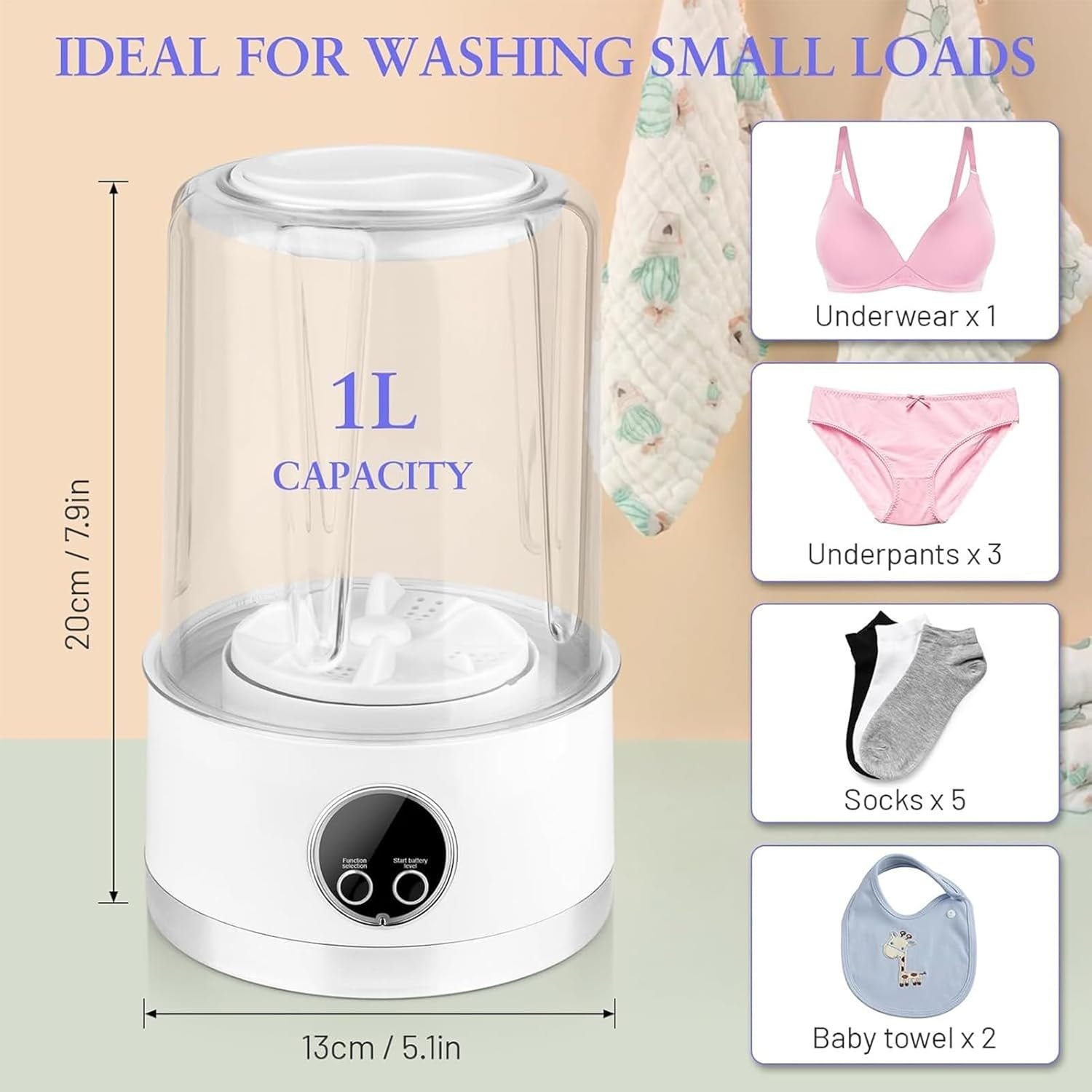 Washing and compact for delicates: With a capacity of 1 liter and a washing motion, this mini washing machine is designed to effectively clean delicate garments such as underwear, bras, socks and baby clothes, helping to care for fabrics.