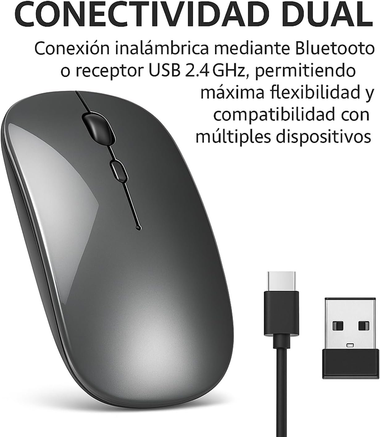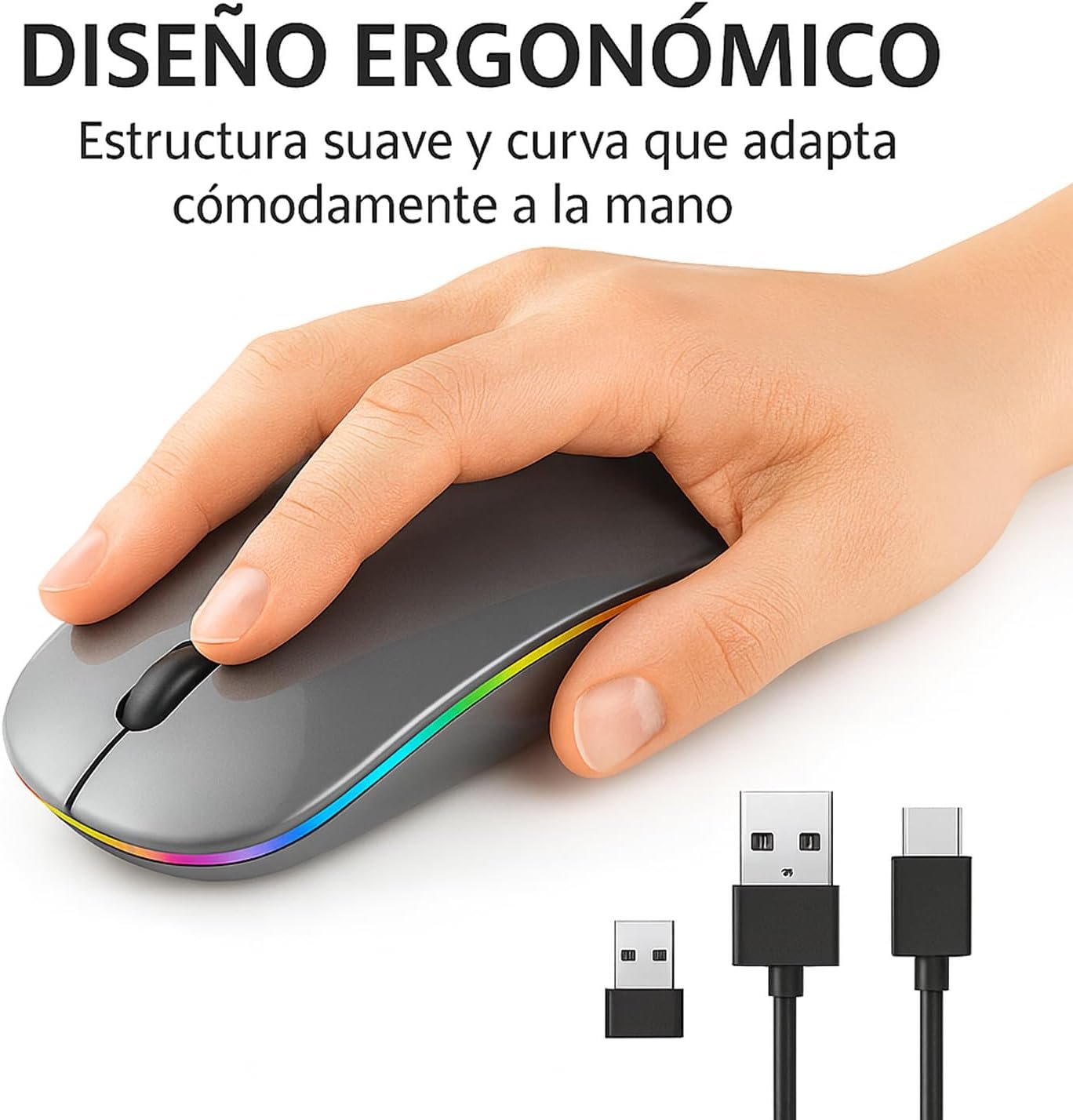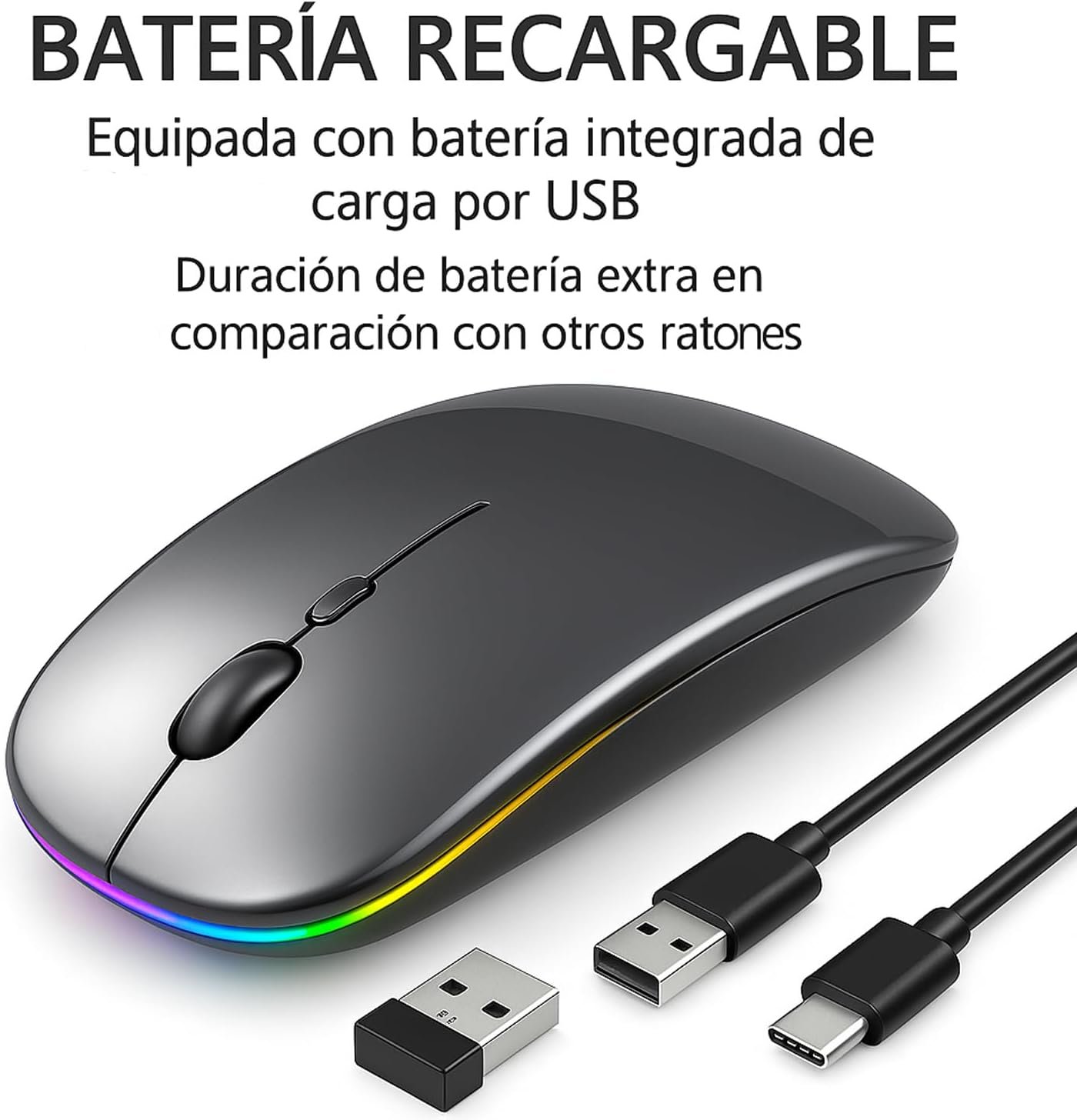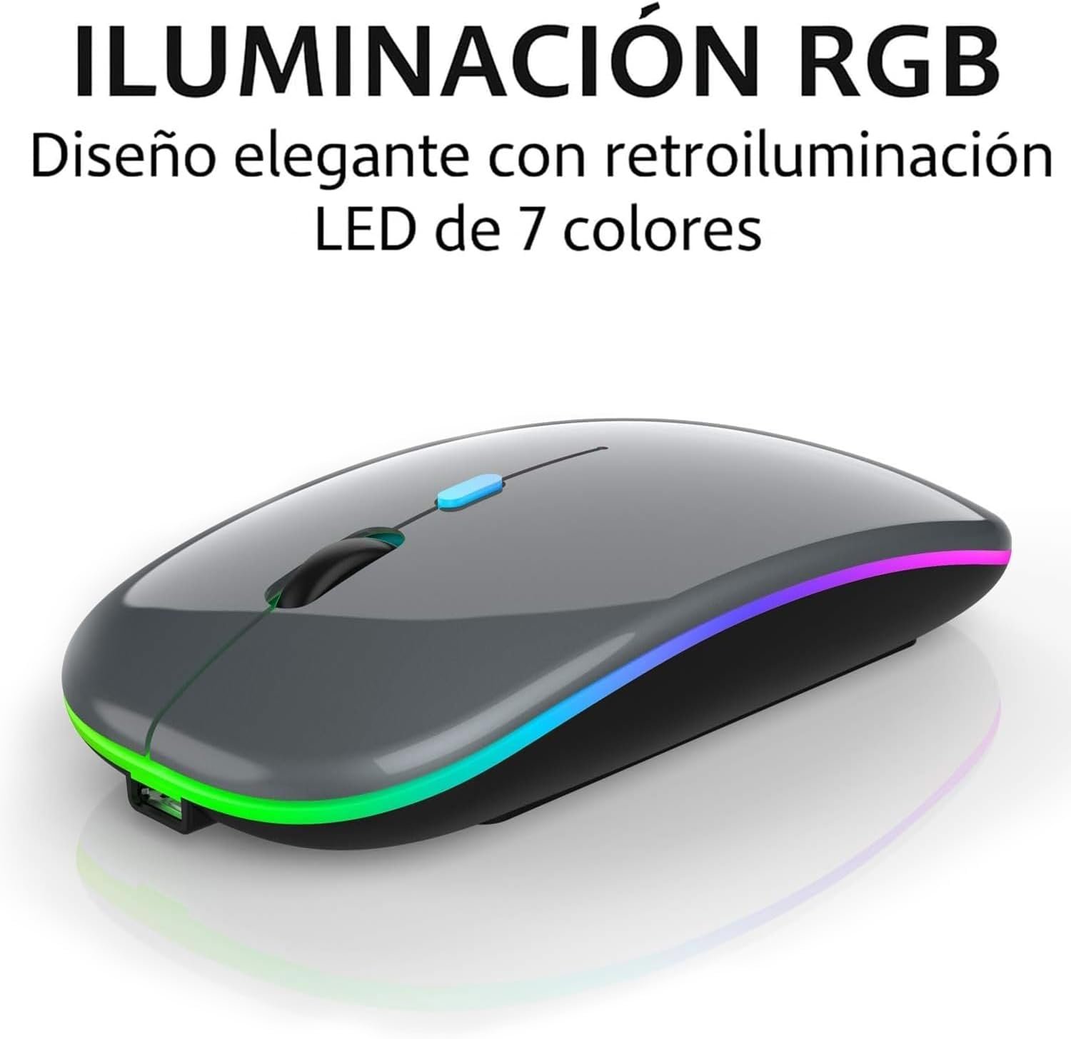 Discover the ultimate control experience with this stylish wireless mouse. Equipped with Bluetooth technology and a 2.4GHz USB receiver for a versatile and stable connection, this device combines style and functionality. Its ergonomic design in bright grey is complemented by spectacular 7-color RGB lighting that adds a stunning visual touch to your setup. It is rechargeable, eliminating the need to constantly change batteries. Compatible with a wide range of devices, including laptops, PCs, Chromebooks and notebooks, this mouse delivers precise and fluid response ideal for both work and casual gaming. Its modern and minimalist design, coupled with its quality construction, ensures comfort during long sessions of use. Customizable LED lighting not only enhances aesthetics but also provides a unique visual experience during night use.Battery Indicator: The visible battery indicator design on the bottom of the mouse allows you to know the battery level and charge the mouse in time. Say goodbye to battery anxiety (only light up during use). Wide compatibility, this rechargeable mouse works for Windows 7/8/10/XP, Vista, Linux, Mac OS, Chrome OS etc.It is compatible with computers with USB C port, such as MacBook Pro after 2016, MacBook Air after 2018, Chromebook, Smart TV, Tablets and more. Ultra-thin mouse design, easy to store in laptop bag, perfect for carrying with you. 3 adjustable DPI levels (1000-1200-1600 DPI), allow you to freely control the speed of the mouse. The mouse for computer and other devices has a soft and curved structure that fits comfortably in the hand for prolonged use, our gaming mouse makes it possible to carry it easily without taking up space.