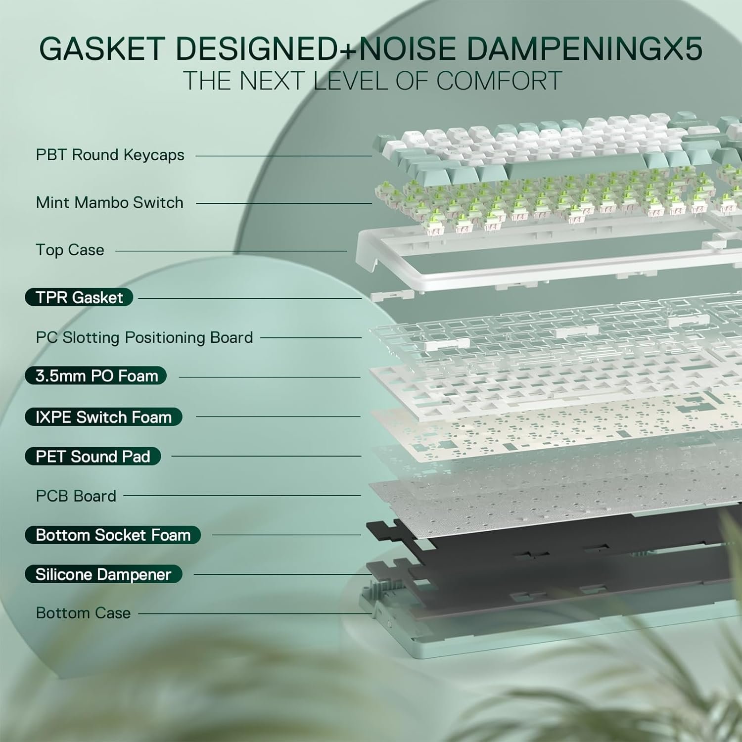 Noise Dampening x 5 – Equipped with 3.5mm PO foam, IXPE switch foam, PET muffler, floor base foam and silicone base and silicone gasket. This greatly reduces hollow noise and creates muffled and ultra-pure tip acoustics, making every keystroke satisfying and enjoyable