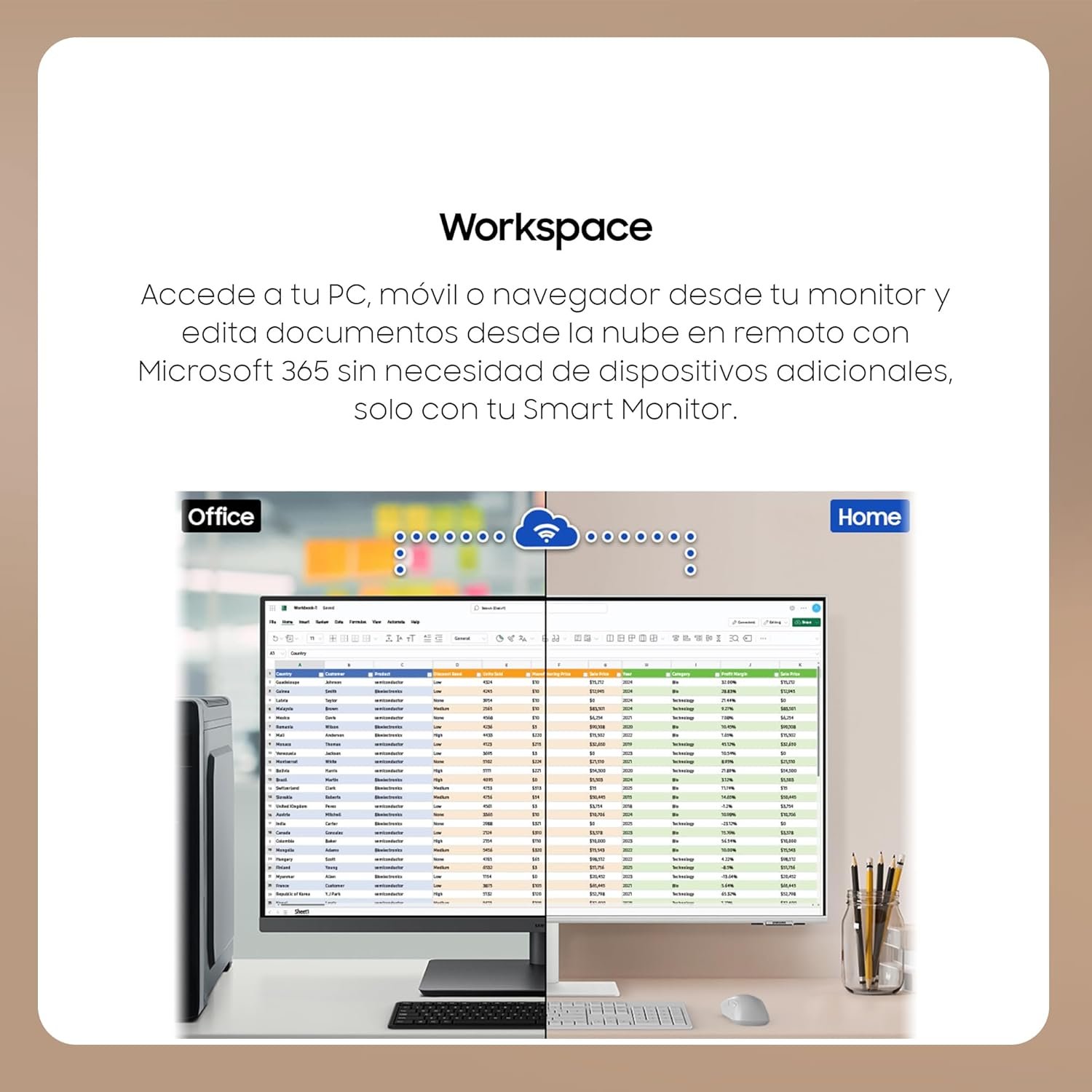 Workspace: Access your PC, mobile or browser from your monitor and edit documents from the cloud remotely with Microsoft 365 without the need for additional devices, just with your Smart Monitor.