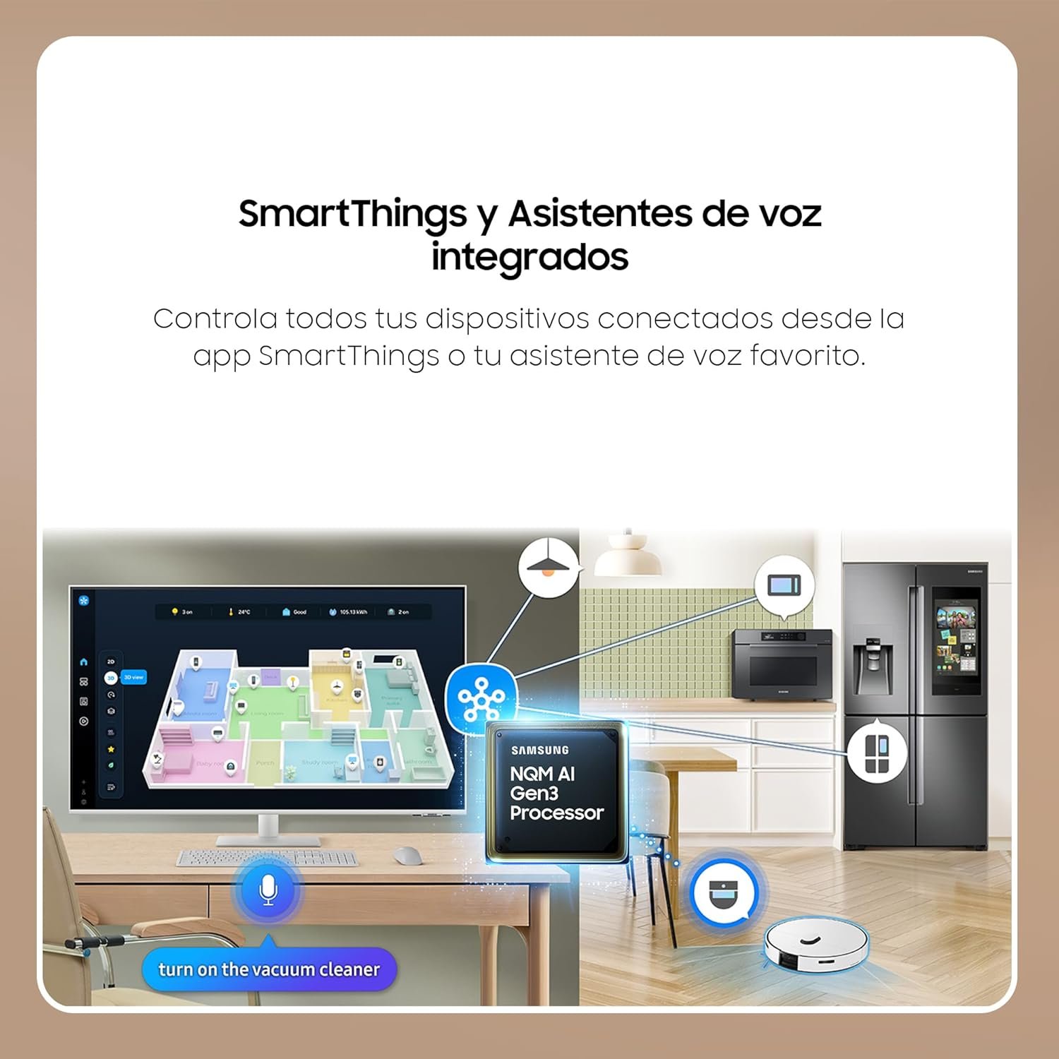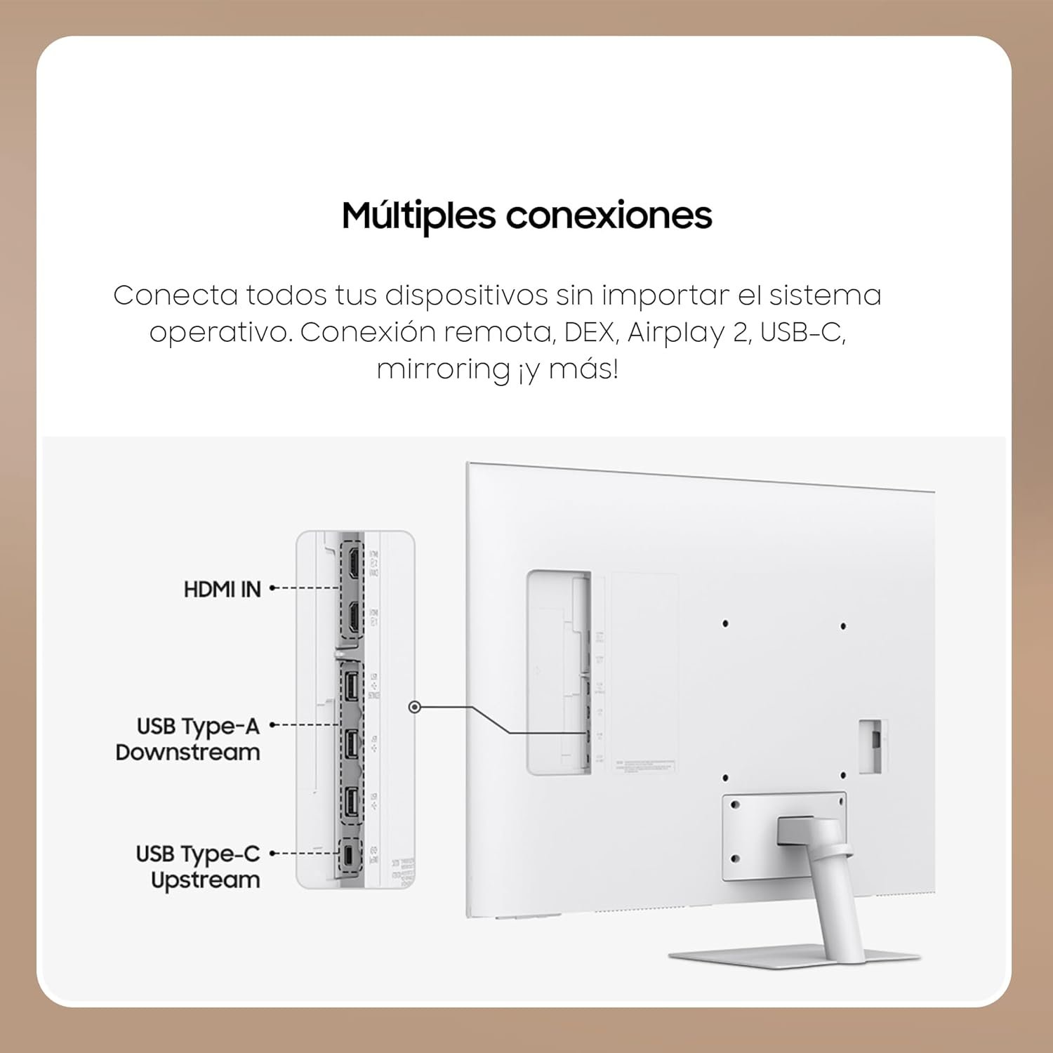 ¹ Las funciones, los servicios y la disponibilidad de las aplicaciones pueden variar según el país y la región. ² Samsung TV Plus y Universal Guide pueden no estar disponibles en algunas regiones. ³ Algunas funciones pueden requerir suscripciones independientes. ⁴ La interfaz de usuario está sujeta a cambios sin previo aviso. ⁵ Este monitor inteligente no incluye sintonizador de TV, que no es necesario para las aplicaciones de streaming. ⁶ Se requiere conexión a Internet. ⁷ Las especificaciones del mando a distancia varían según el país y la región. ⁸ La compatibilidad del control mediante teclado y ratón varía según la aplicación. ⁹ Para acceder a todas las funciones inteligentes, como los servicios basados en red, las aplicaciones (incluidos los juegos y los servicios de streaming) y la funcionalidad de hogar inteligente, es necesario disponer de una cuenta Samsung. Sin iniciar sesión, la funcionalidad se limita a dispositivos externos, por ejemplo, a través de HDMI. Puede registrarse para obtener una cuenta Samsung en la web de Samsung. Se aplican términos y condiciones.¹⁰ Función disponible solo en determinadas regiones y modelos. ¹¹ La función estará disponible en cable y Samsung TV Plus. ¹² Los detalles sobre los actores se proporcionan en función de los metadatos asociados al contenido que estás viendo. Es posible que esta información no siempre sea completa o correcta, por lo que te recomendamos que compruebes los detalles sobre los actores.¹³ Gaming Hub solo está disponible en determinados países, y la disponibilidad de las aplicaciones varía según el país. La interfaz de usuario está sujeta a cambios sin previo aviso. ¹⁴ El acceso a Gaming Hub es gratuito. Es posible que se requiera una suscripción para acceder al contenido ofrecido por las plataformas de streaming de juegos en Gaming Hub. ¹⁵ Es posible que tengas que descargar aplicaciones dependiendo del juego o servicio. ¹⁶ Es posible que se requiera un mando independiente dependiendo del juego específico al que estés jugando en Gaming Hub. ¹⁷ Requiere conexión a Internet.¹⁸ El contenido y los servicios pueden variar según la región y están sujetos a cambios sin previo aviso. ¹⁹ Es necesario aceptar los Términos y condiciones y la Política de privacidad de Smart Hub antes de utilizarlo. ²⁰ Algunos contenidos y servicios requieren registro y suscripción. ²¹ Requiere una cuenta Samsung. ²² Las actualizaciones del sistema operativo Tizen serán compatibles durante un máximo de 7 años a partir de 2025, para los productos lanzados en el año 2025. ²³ Tenga en cuenta que la actualización no cubre el rendimiento, las características ni la durabilidad relacionados con el hardware.²⁴ Solo disponible cuando se utiliza una conexión a PC. ²⁵ La calidad de imagen admitida puede variar en función del tipo de contenido detectado por la función.²⁶ La disponibilidad de 4K en contenidos over-the-top puede variar en función del tipo de suscripción al servicio de contenidos y de la conexión a Internet.²⁷ Imágenes de pantalla simuladas con fines ilustrativos.²⁸ La tecnología, las funciones y las características pueden variar según el país, el operador de servicios, el entorno de red o el producto, y están sujetas a cambios sin previo aviso. ²⁹ Requiere conexión Wi-Fi, Bluetooth u otra conexión de red inalámbrica, y dispositivos registrados en la aplicación SmartThings. ³⁰ Los dispositivos conectados se venden por separado. Para obtener una lista completa de dispositivos compatibles, consulte la web de SmartThings.³¹ Samsung Knox protege el Smart Monitor y sus conexiones IoT a través de la aplicación SmartThings. No proporciona protección directa contra piratería informática o ataques físicos a dispositivos IoT. ³² Las actualizaciones de software de seguridad están aseguradas durante al menos cinco años desde el lanzamiento del producto. Se requiere la última actualización de software.