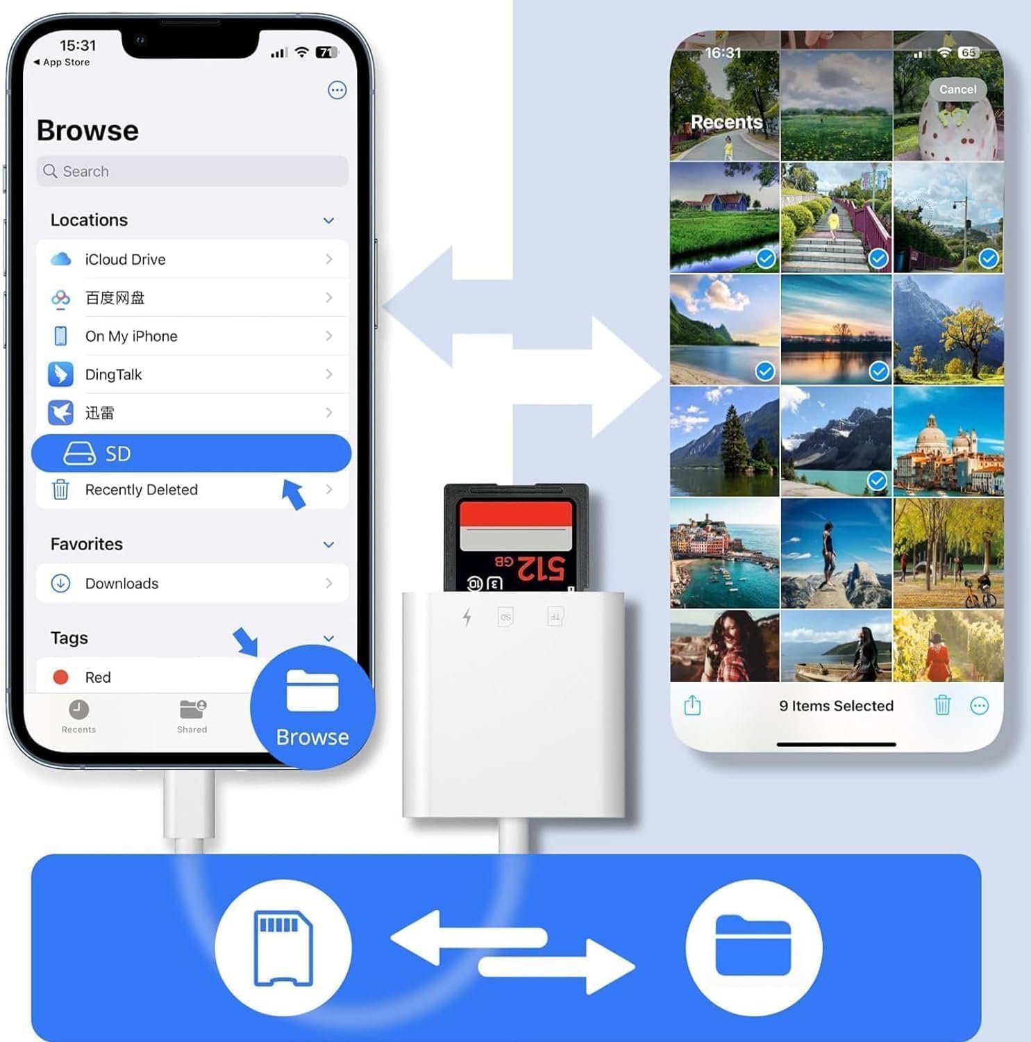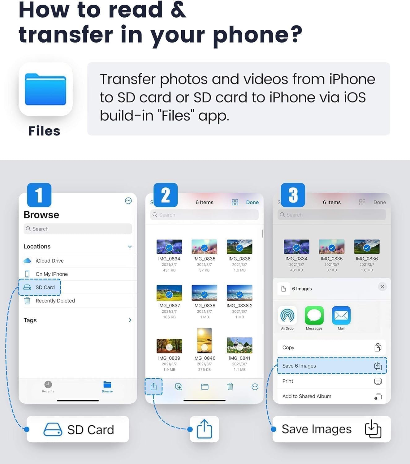 Two-way transmission: For iOS 13 and above systems, this SD card reader for phone supports two-way transmission. Plug and Play. The SD card reader does not require third-party apps, uses the built-in iOS file app and supports video playback
